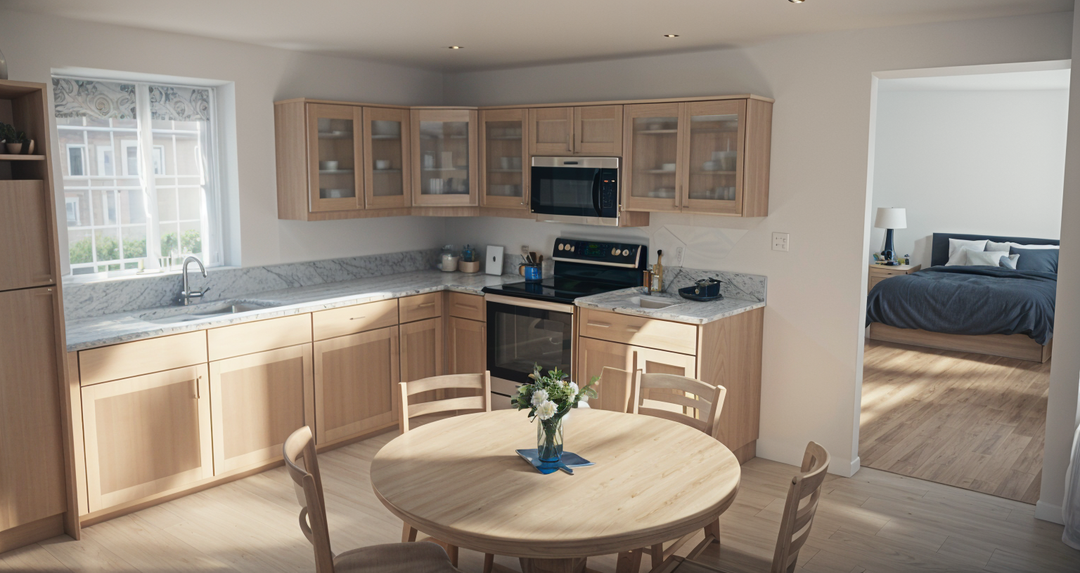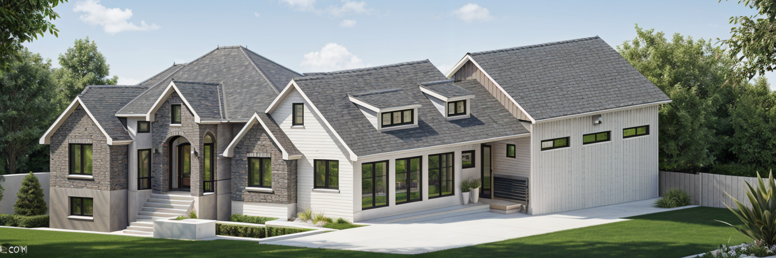 modernist exterior shot render a detailed modern house with a classic touch featuring a light gray stone exterior complemented by cream colored walls the roof should be a slate gray with subtle texture and the windows are large with white frames allowing natural light to flood in add a lush well manicured lawn with vibrant green grass surrounding the house and a few flowering bushes with pink and purple blossoms the porch should have a wooden texture with a natural oak finish the sky is clear with a soft golden hue indicating a setting sun casting a warm glow on the scene creating a welcoming and serene atmosphere architecture
