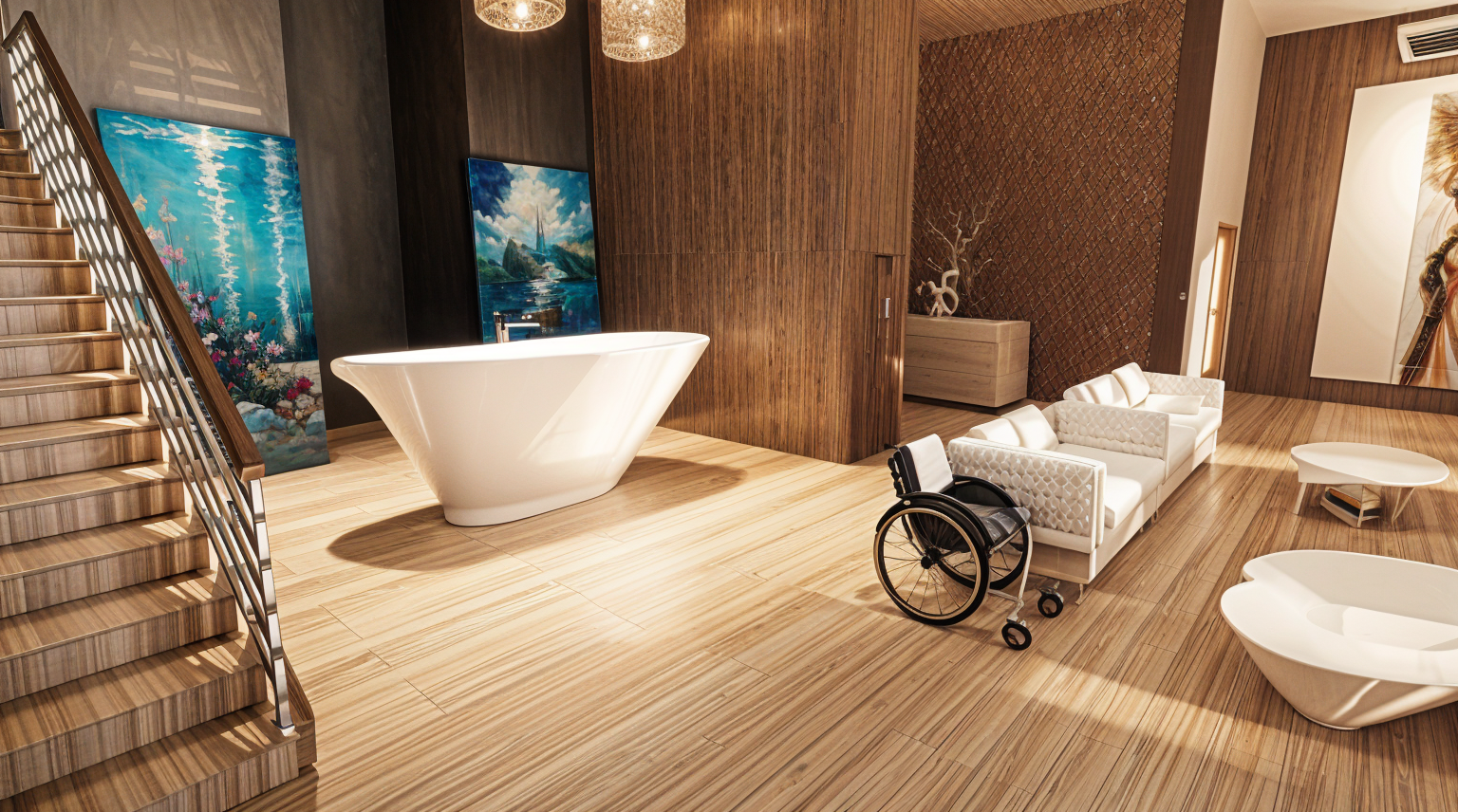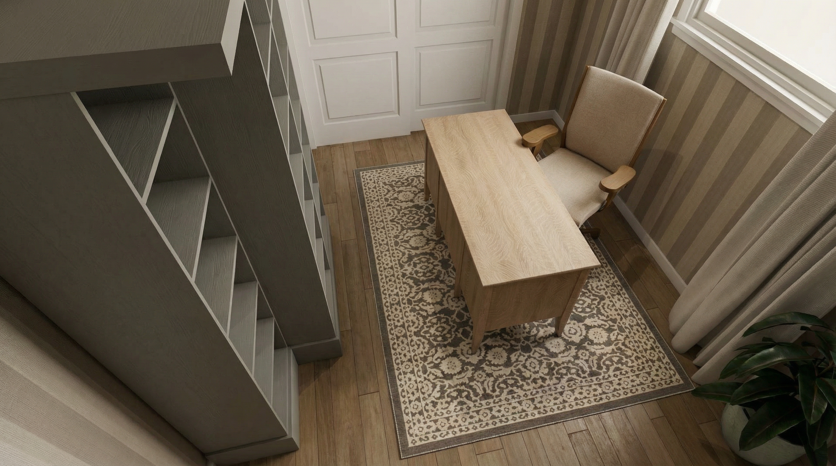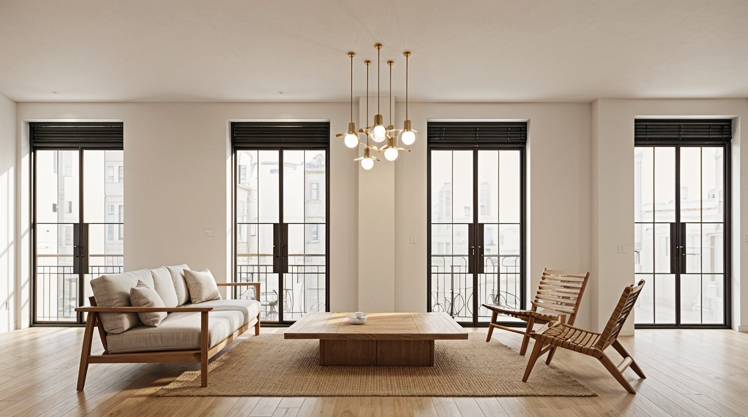 create a highly realistic image of the interior space and maintain the geometry modern elte furniture design soft lighting coming through feature ceiling light pendants with crown moulding at the top and coffered ceilings