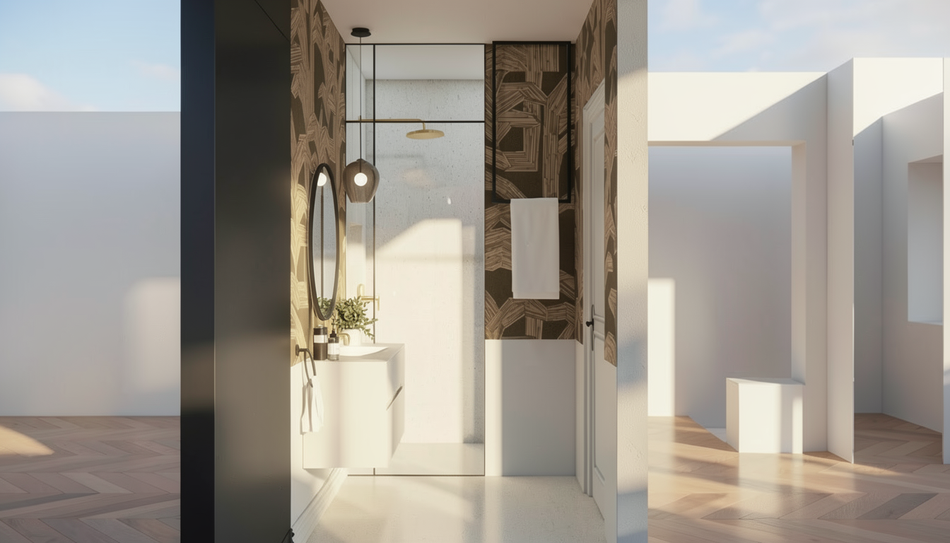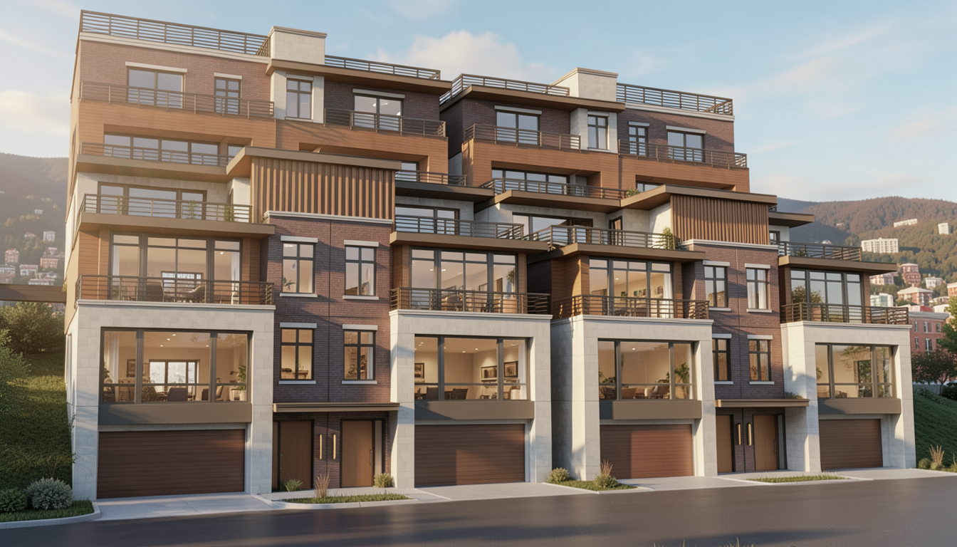 ltra photorealistic architectural rendering in a cinematic real time visualization style unreal engine d5 render quality late morning daylight with slightly angled sun creating soft defined shadows balanced exposure with no blown highlights low bloom and controlled dynamic range warm neutral color grading with subtle warm highlights and neutral shadows no blue tint natural material response with warm light reflecting off wood and ground surfaces slight contrast boost with clean crisp edges and subtle ambient occlusion clear atmosphere with no fog or haze but natural depth created through slight background softening and contrast falloff foreground and main subject remain sharp and detailed minimal curated landscaping with natural but slightly desaturated greenery no overgrown vegetation cinematic composition realistic sky with soft blue tones and light clouds professional architectural visualization style sharp focus 8k resolution lit and fully furnished interiors behind windows road with driveways to garages in foreground building built into hill looking up at building on hill with hillside historic mt adams city of cincinnati ohio in background