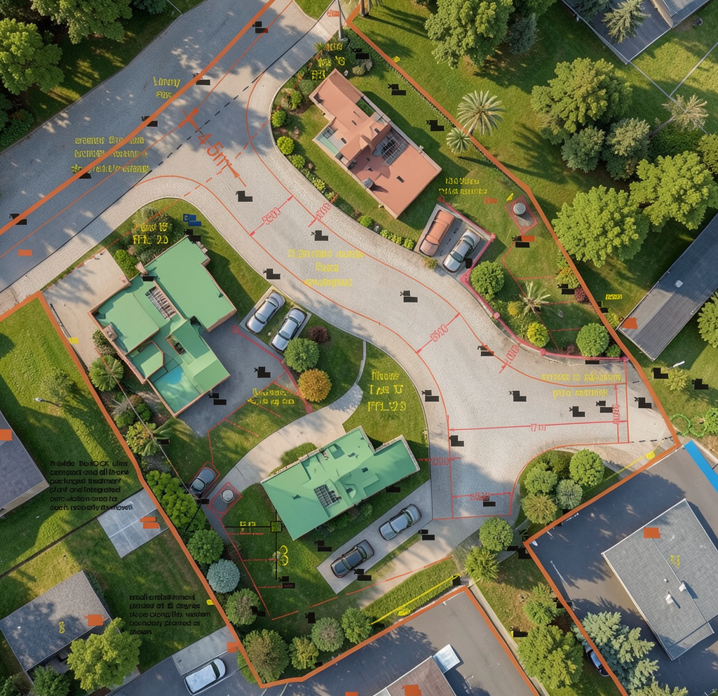 can you colour up and landscape this site plan with the 3 houses shown as a solid block colour can you remove all text from the image too
