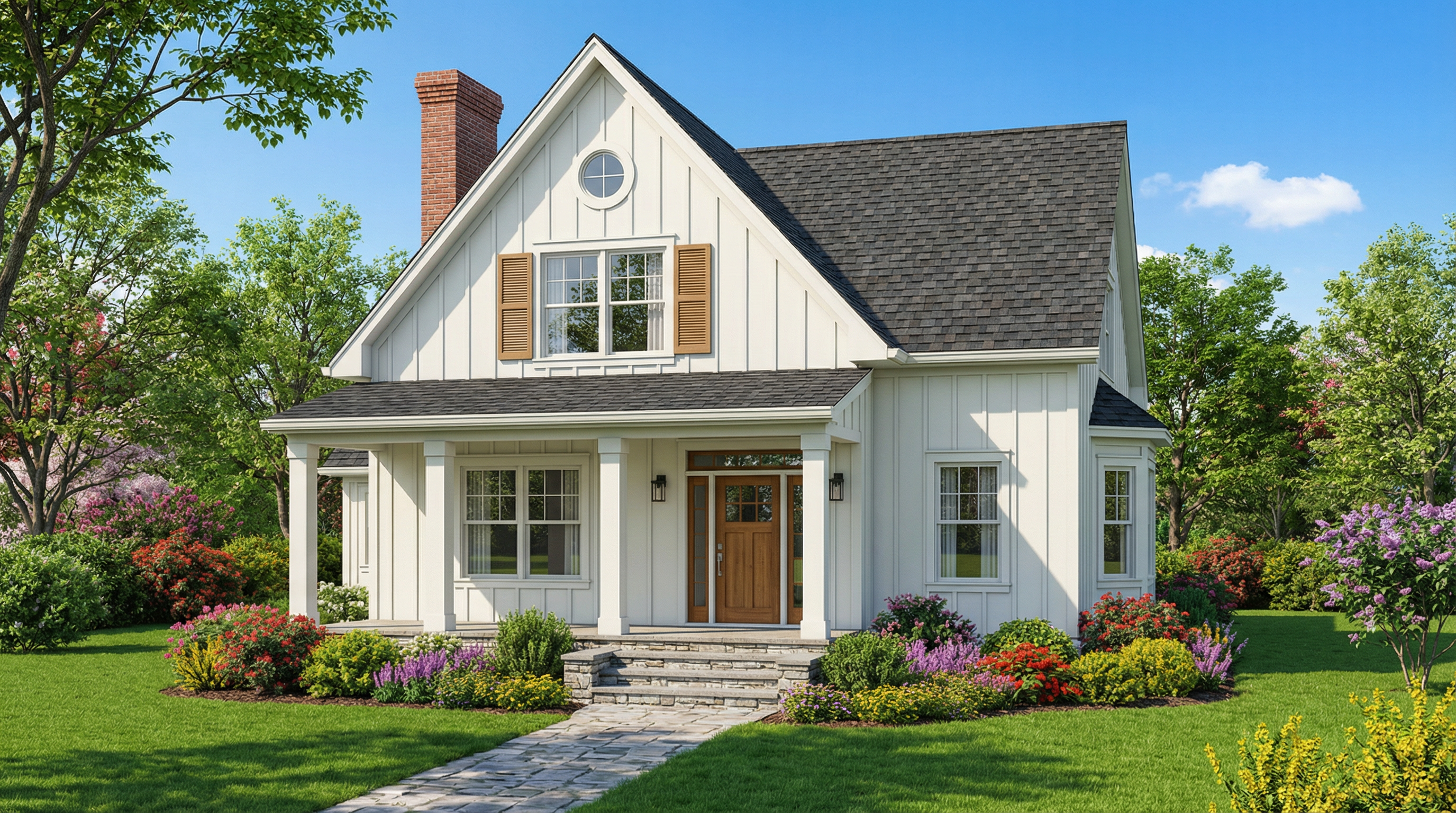 a manicured lawn layered flower beds low maintenance shrubs native plants gravel driveway