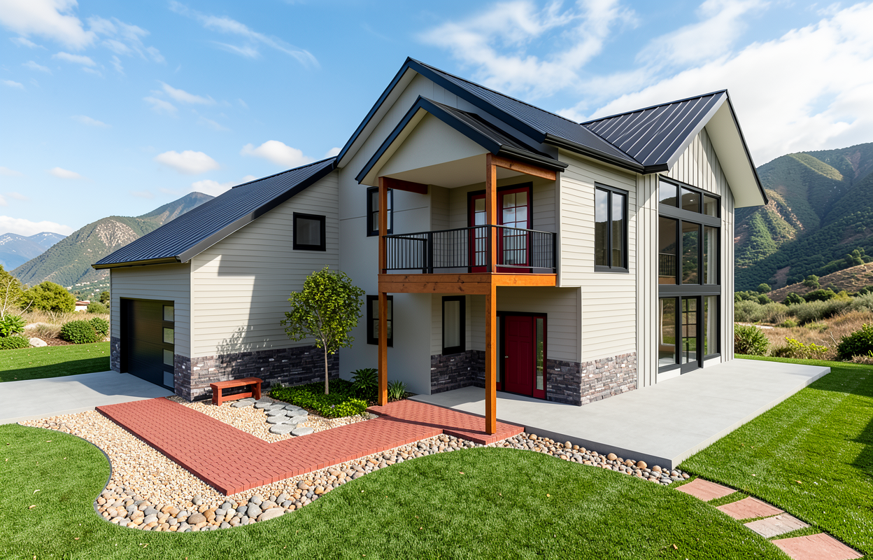 create a stunning architectural rendering of a residential floor plan use soft neutral tones for the walls like beige and light gray for an elegant feel highlight the kitchen area with a light wood finish and stainless steel for the utensils and appliances utilize warm oak for the dining area table with soft white chairs add indoor plants near the living area for a touch of greenery the bedrooms should have pastel colored walls with plush bedding in shades of white and beige the bathroom should be rendered with sleek white tiles and chrome fixtures add ambient natural lighting throughout the space for a warm and inviting atmosphere