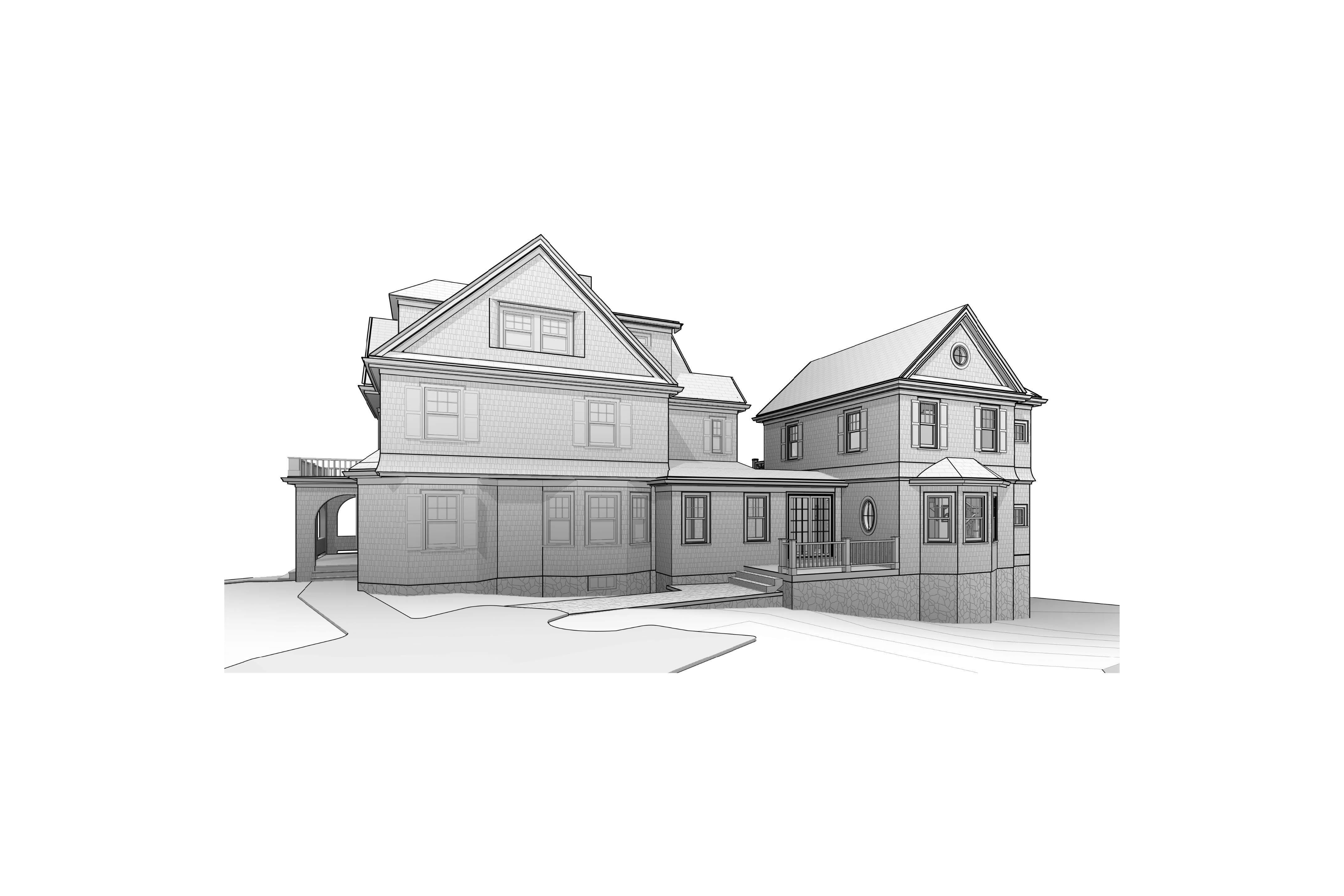maintain accuracy to original building geometry add trees in the background street on the left of building exterior siding is cedar shingles painted gray window trim and shutters are painted white no corner boards