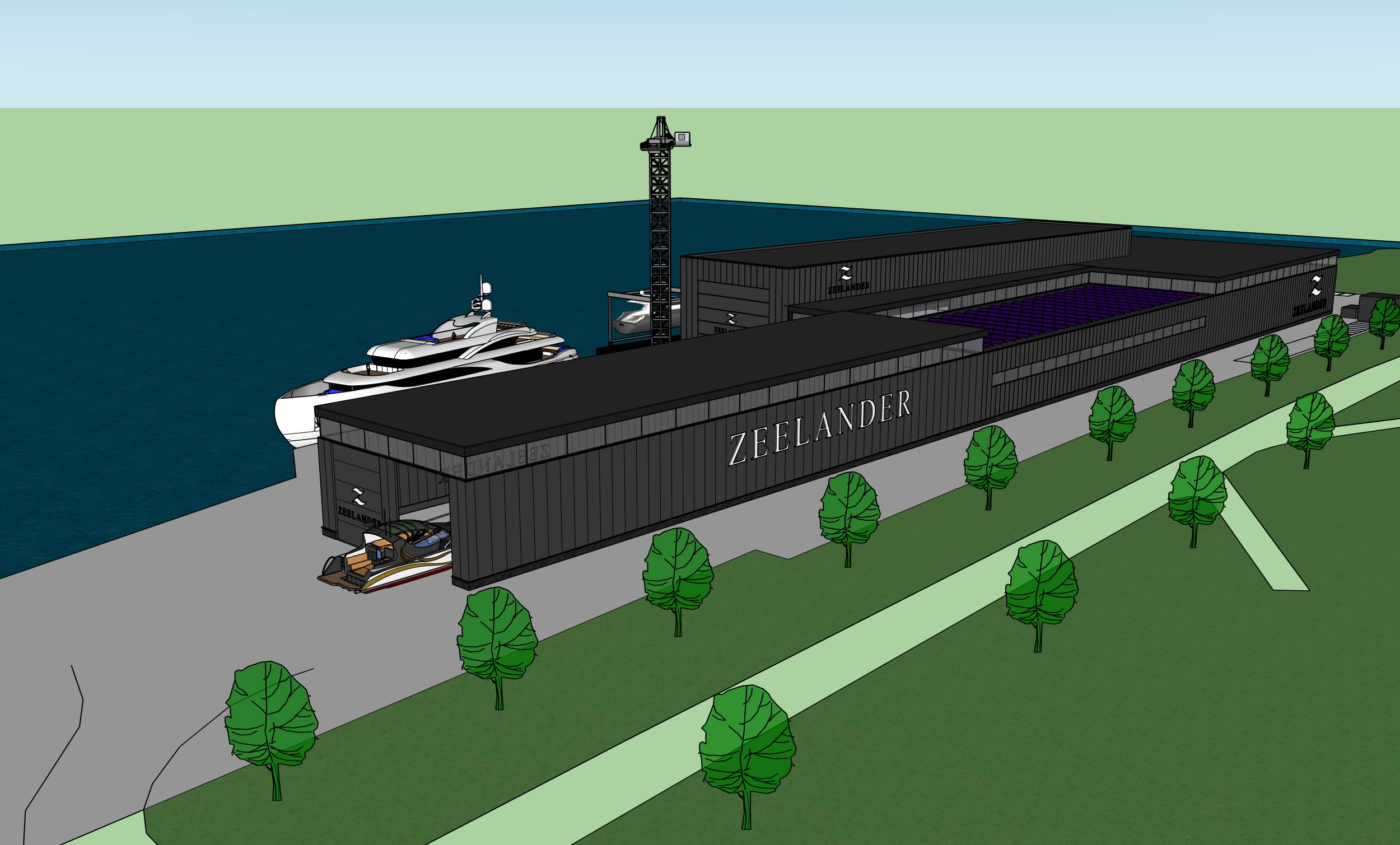 the weather is sunny with a few clouds make the cars and boats look realistic keep the materials and colours of the buildings exactly the same as in the original add some people around the buildings the light green area in the background is water