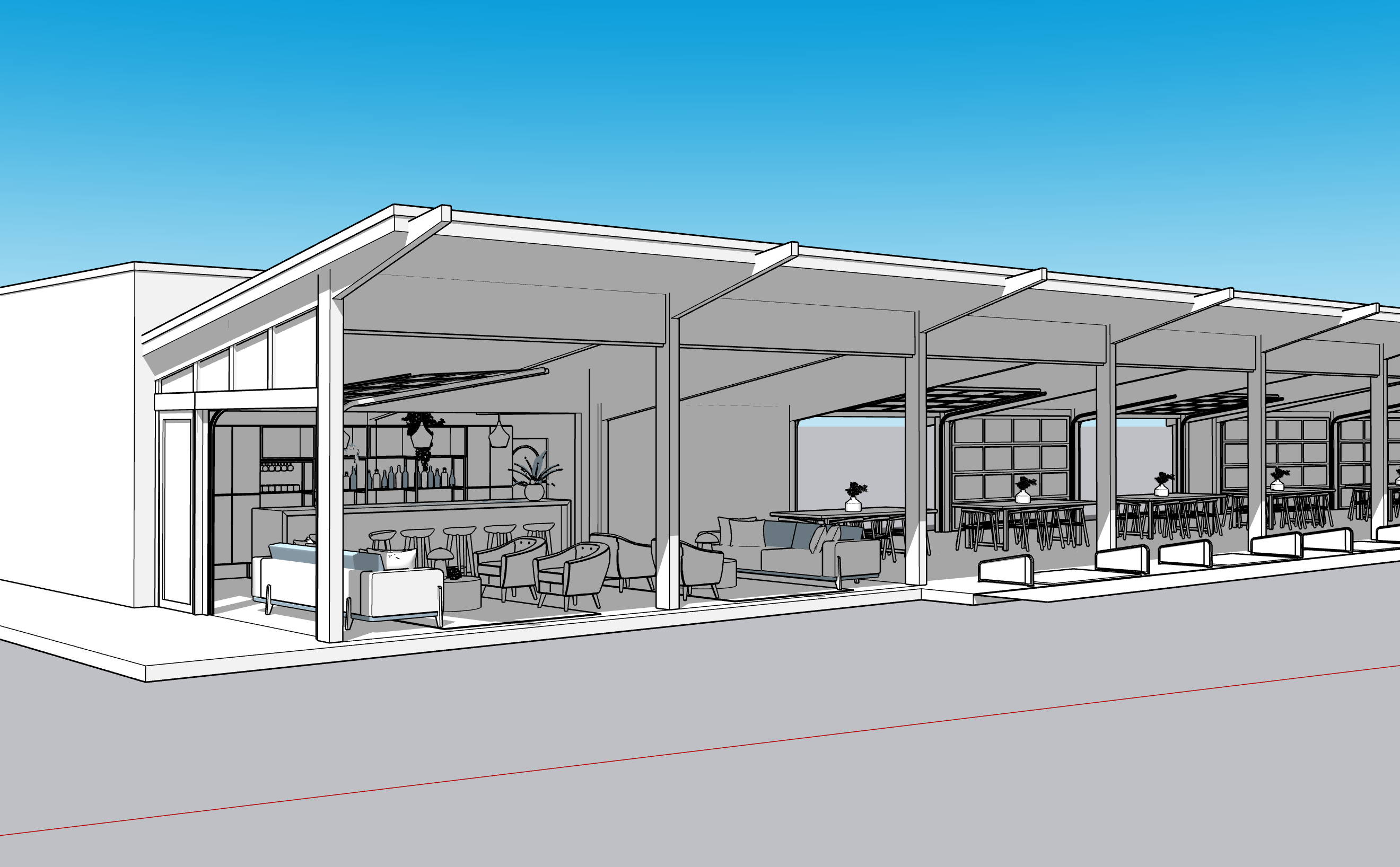 exterior perspective looking into the building toward the west end positioned just south of the structure at the edge of the driving range where the grade drops away immediately beyond the open bays the entire south fa ade is composed of open air bays all of which admit abundant natural light into the interior this creates a continuous wash of daylight across the full width of the space with soft late day sun casting long horizontal shadows that articulate structure furnishings and floor texture additional daylight enters from a glazed overhead garage door on the west wall providing a secondary directional glow that draws the eye deeper into the lounge bar area and creates layered light conditions the left two bays are occupied by a lounge bar program the bar is positioned to receive and reflect both the southern and western light emphasizing material richness wood stone and metal surfaces subtly illuminated seating groups are distributed within this field of daylight with overhead lighting and ceiling fans adding a warm ambient layer beneath the structure to the right two active golf simulator bays are visible though still open to the south and receiving natural light these bays are visually differentiated through slightly more controlled lighting screen illumination and subtle architectural framing the simulator areas feel energetic and social with small groups engaged in play the transition between lounge and simulator zones is legible through light modulation and spatial cues rather than enclosure maintaining openness while expressing distinct program beyond the open bays the terrain drops away immediately into the driving range extending views outward toward woodland hills golf course and anchoring the interior experience within its landscape setting