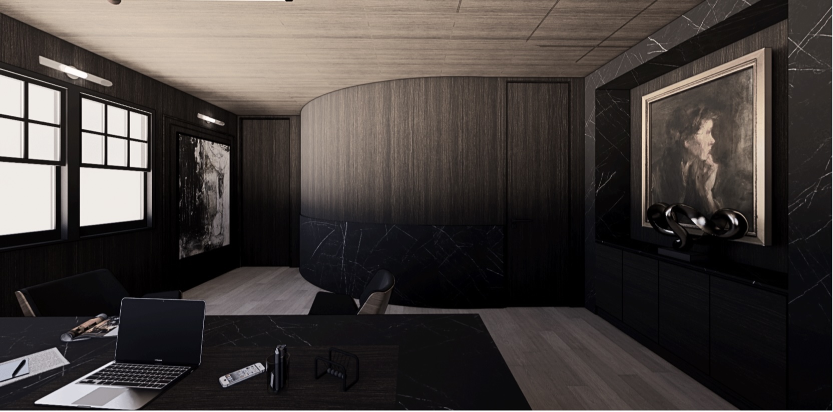 international style interior shot lighten the space add bookshelves and a tv to the curved wall add a bar to the right hand wall where the artwork is architecture