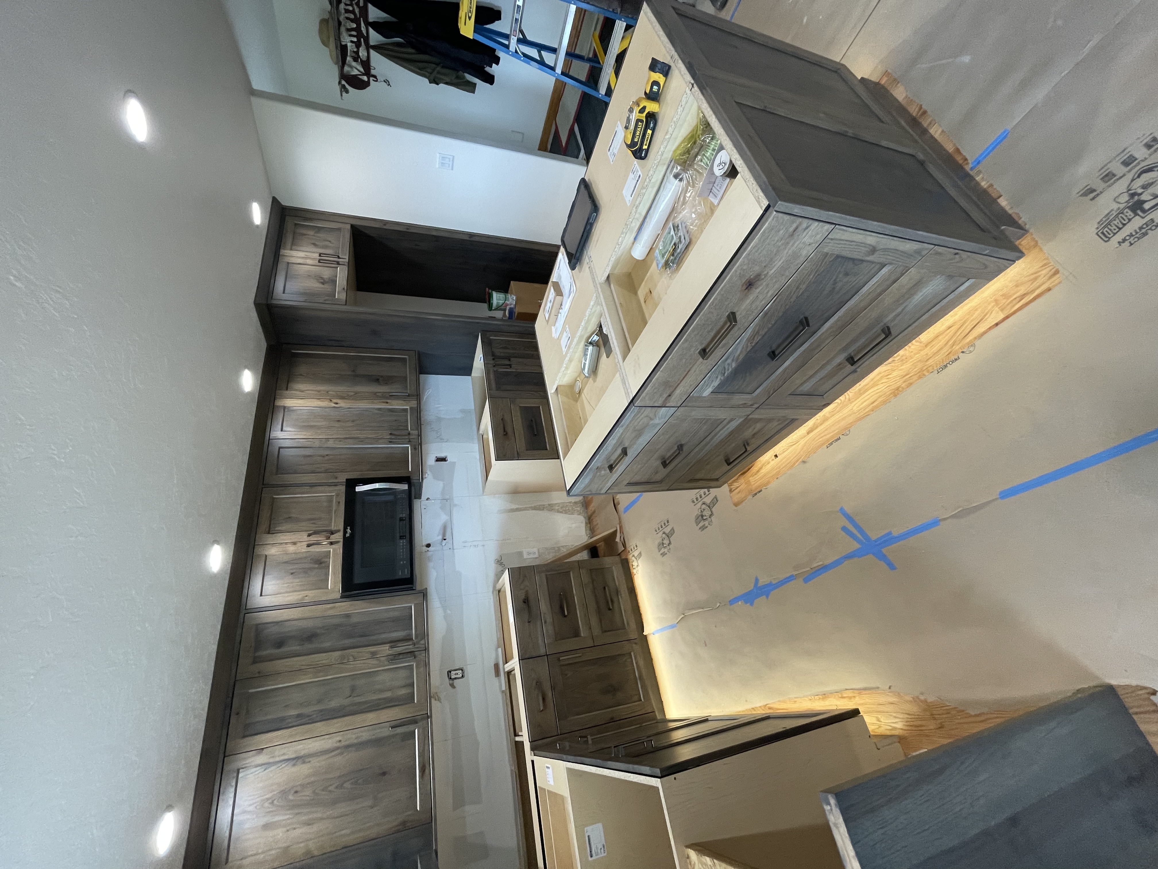 do not change the cabinets in any way preserve the exact cabinet colors materials finishes dimensions door and drawer styles hardware spacing alignment and all geometry exactly as shown do not alter the countertop shape backsplash appliances flooring lighting fixtures or wall structure only remove the construction materials clutter and mess from the scene clean the room and make it look finished and staged add a few simple tasteful home accessories appropriate for the style of the space but do not add or remove any furniture windows or architectural elements maintain the original lighting direction and realism enhance clarity and polish the photo while keeping the cabinetry and room design completely unchanged do not alter the lighting to keep the cabinet colors as they are in the image add a range below the microwave add a refrigerator to the opening on the far right add new flooring and countertops stage for a kitchen