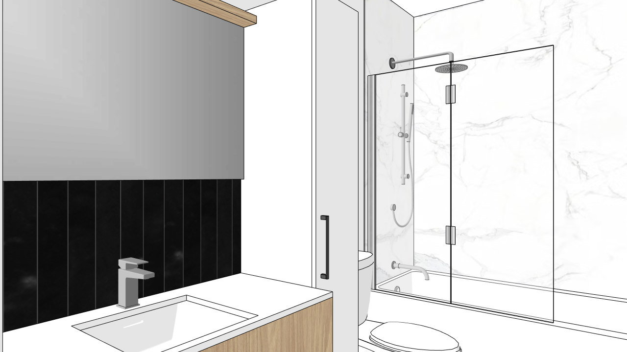 generate a photorealistic rendering of this small residential bathroom bathroom materials white cabinets in sublime polymer with a matte finish color 734 tafisa melamine cabinet with a wood effect finish color m2007 white quartz contertop shower wall in muraluxe panels matte white calacatta effect black cabinet handles chrome faucets glossy black tile on the vanity backsplash