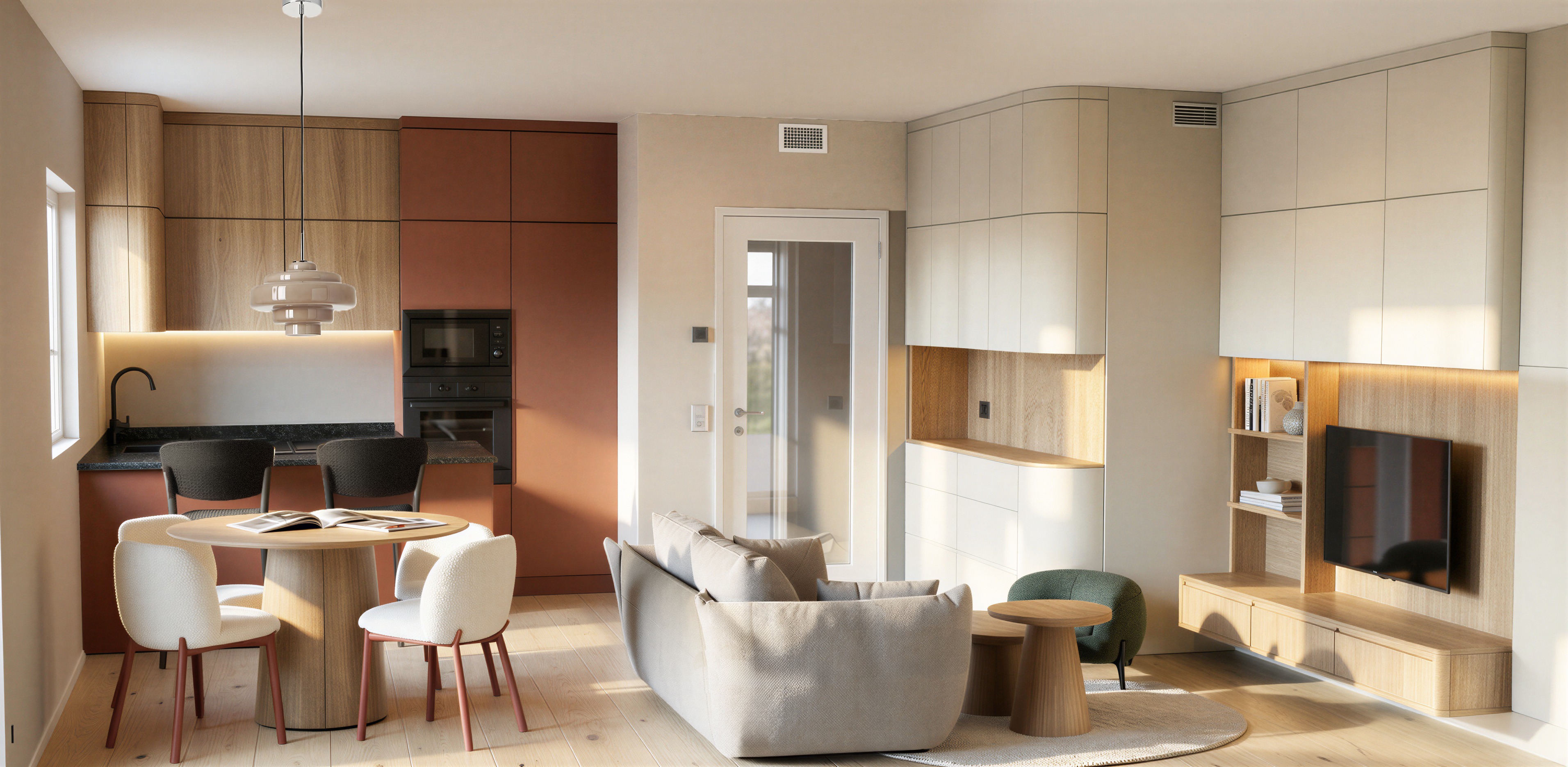 use the provided image strictly as the base image lock the camera angle perspective composition room geometry furniture placement object proportions materials and colors do not redesign the space and do not modify any furniture cabinetry or layout edit only the wall surfaces that are currently white plaster 1 left wall remove the window completely and replace it with a continuous flat wall finished with smooth concrete plaster microcement concrete skim coat the wall should look seamless minimal and architectural 2 kitchen back wall apply the same concrete plaster finish on the kitchen wall surface that is located between the upper kitchen cabinets and the countertop the concrete plaster should visually continue from the left wall into this kitchen backsplash area so it reads as one continuous material important material rules apply the concrete plaster only on surfaces that are currently white plaster do not apply the concrete finish on cabinets shelves furniture doors appliances wood panels or the tv wall do not change the oak wood surfaces terracotta cabinet block or any wooden elements do not cover the cabinets or extend the plaster above or onto them the concrete plaster should exist only on wall areas lighting remove the sunlight patches and shadows that were previously created by the window on the left wall the new wall should have soft even lighting preserve everything else exactly kitchen layout and cabinetry terracotta kitchen cabinet block with built in oven dining table chairs and pendant light sofa coffee tables and rug tv wall and shelving floor material and plank orientation all objects decorations and lighting in the rest of the interior do not add new objects do not move furniture and do not modify materials anywhere else the only change should be replacing the white plaster walls with concrete plaster in the specified areas
