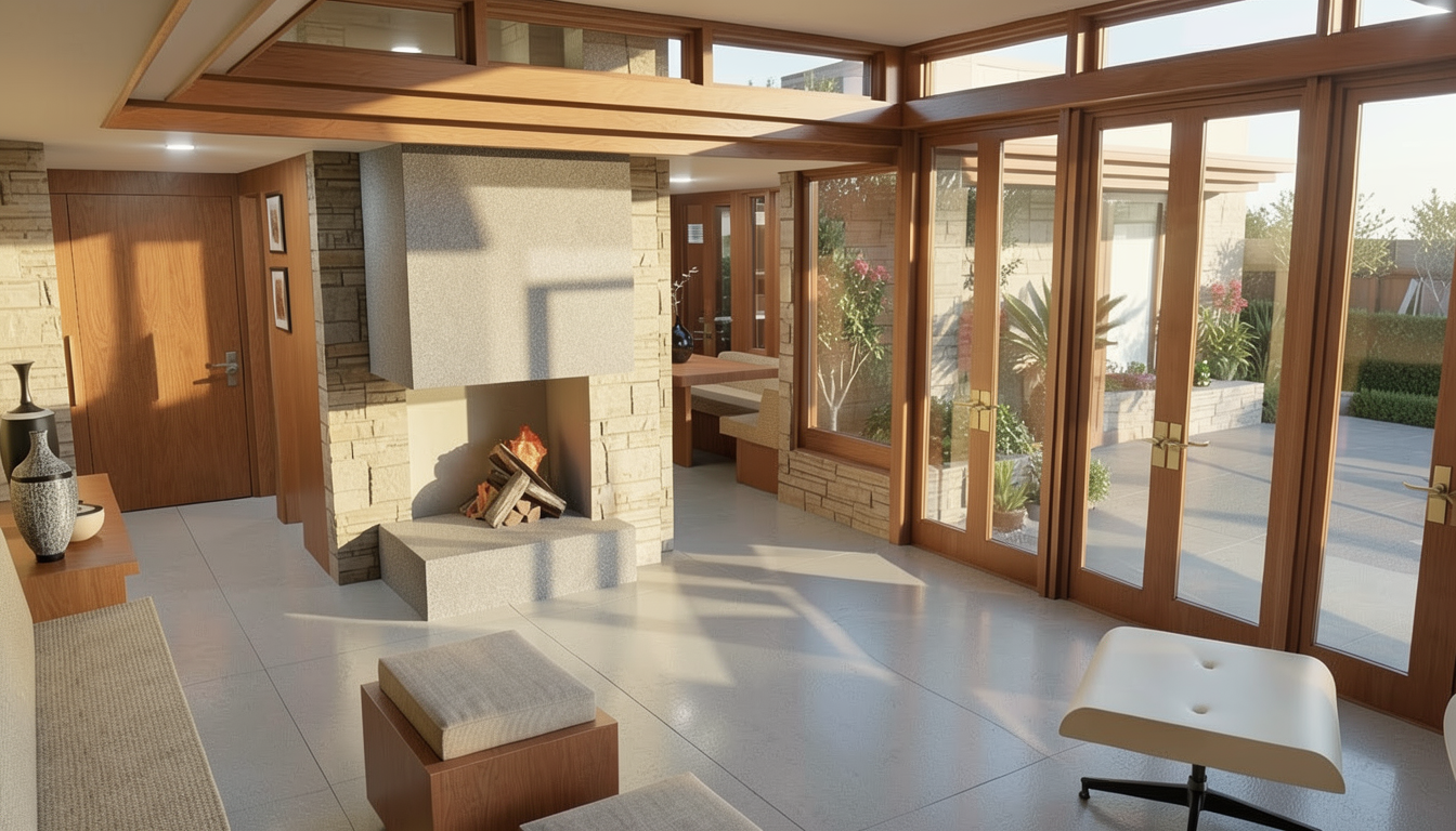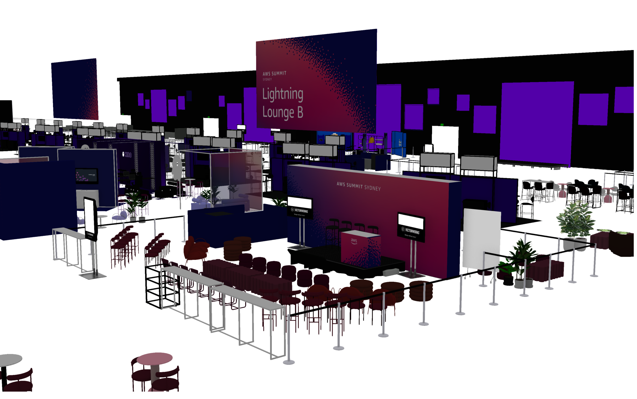 realistic dark expo environment workshop space slightly warm vibrant atmosphere polished concrete floor subtle light focusing on main space have business people with peach glowing headphones sitting at the seats in front of the peach wall slight blur of background have people walking past blurred light square gobo lights on floor scattered