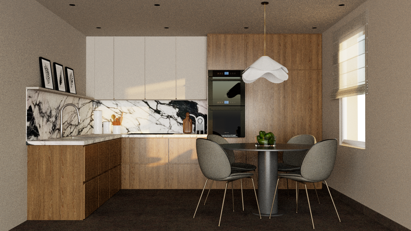ultra realistic editorial interior render of a compact modern kitchen dining space maintaining original composition and camera framing warm late afternoon natural light entering from the right side window casting soft elongated shadows across surfaces l shaped kitchen layout lower cabinets in natural walnut wood with vertical grain highly realistic wood texture subtle tonal variation and clearly defined panel divisions integrated carved finger pulls u ero with visible depth and precise shadowing upper cabinets in matte lacquered finish cool greyish tone not beige perfectly smooth surface with no reflections the perceived warm golden tones on these cabinets must come exclusively from the sunlight not from the material color itself countertop and backsplash in porcelain marble effect matte finish with slight surface roughness realistic veining black and grey on neutral white base continuous material between horizontal and vertical planes avoiding glossy or plastic appearance walls finished in soft grey painted surface matching the image tone ultra realistic matte paint texture with subtle irregularities and natural light absorption floor in large format porcelain tiles approx 120x120 cm microcement effect rectified edges with almost invisible joints very subtle tonal variation completely matte dining area round table with central pedestal base in brushed stainless steel soft reflections slightly worn industrial finish chairs with upholstered seats in neutral fabric and thin brushed stainless steel legs matching the table and kitchen fixtures on the table a minimal fruit bowl containing pears not avocados natural color variation and organic imperfections sink and faucet in brushed stainless steel matching chair and table structure ceiling with recessed downlights lights off slightly pushed inward deep recessed effect creating soft shadow rings suspended pendant lamp above the table made of papier m ch plaster like material organic wavy shape matte off white finish zara home style softly diffusing light but not turned on window on the right with a light linen roman blind partially lowered soft fabric texture filtering sunlight decor elements minimal and realistic framed prints ceramic objects wooden accessories all with natural imperfections global lighting soft and cinematic slightly warm due to sunlight with mild atmospheric turbidity very subtle grain in air enhancing realism no changes in layout proportions or objects no added elements no stylization beyond photorealism