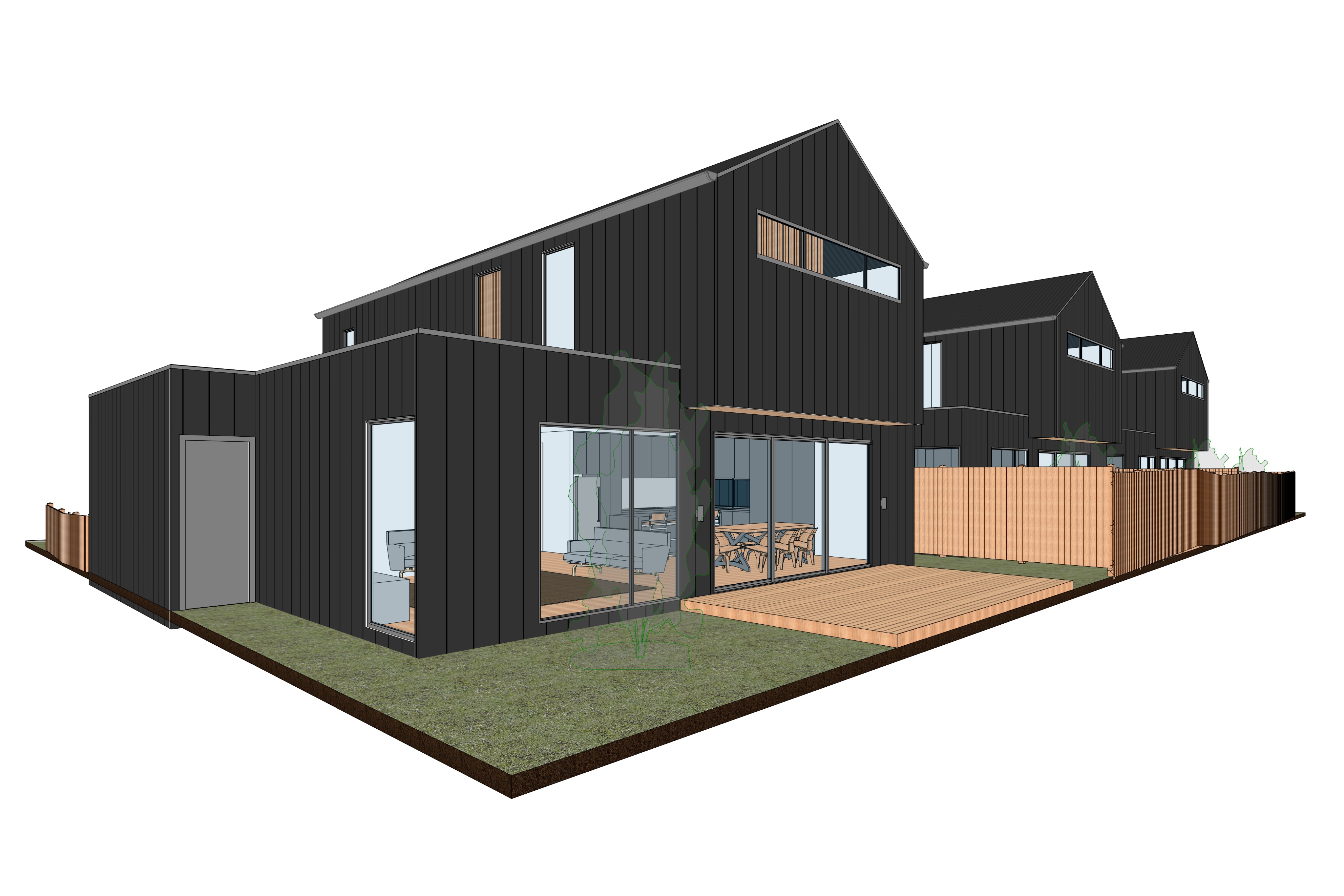 3x townhouse development monument endseam cladding to the upper floor white brickwork on the lower floor with a splash of weathered larch timber large black aluminum window frames native australian landscaping mid morning summer sunlight with overcast sky large gum trees in background