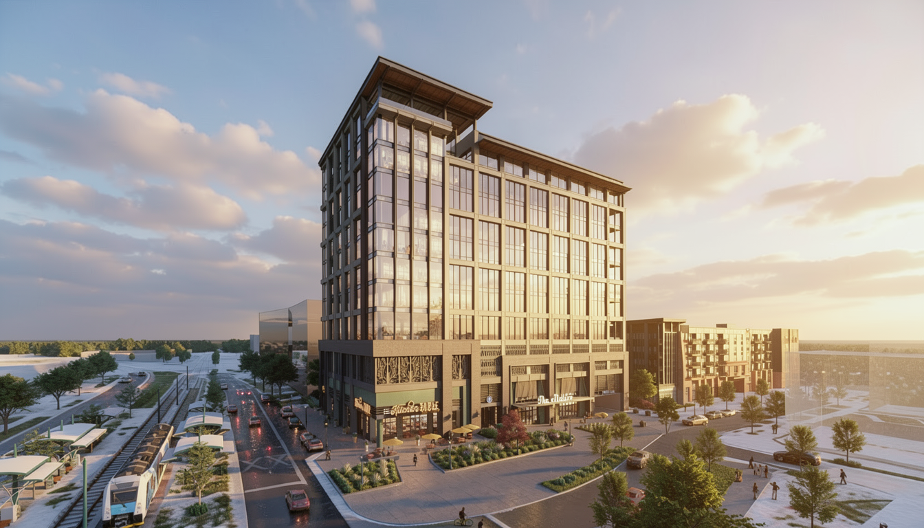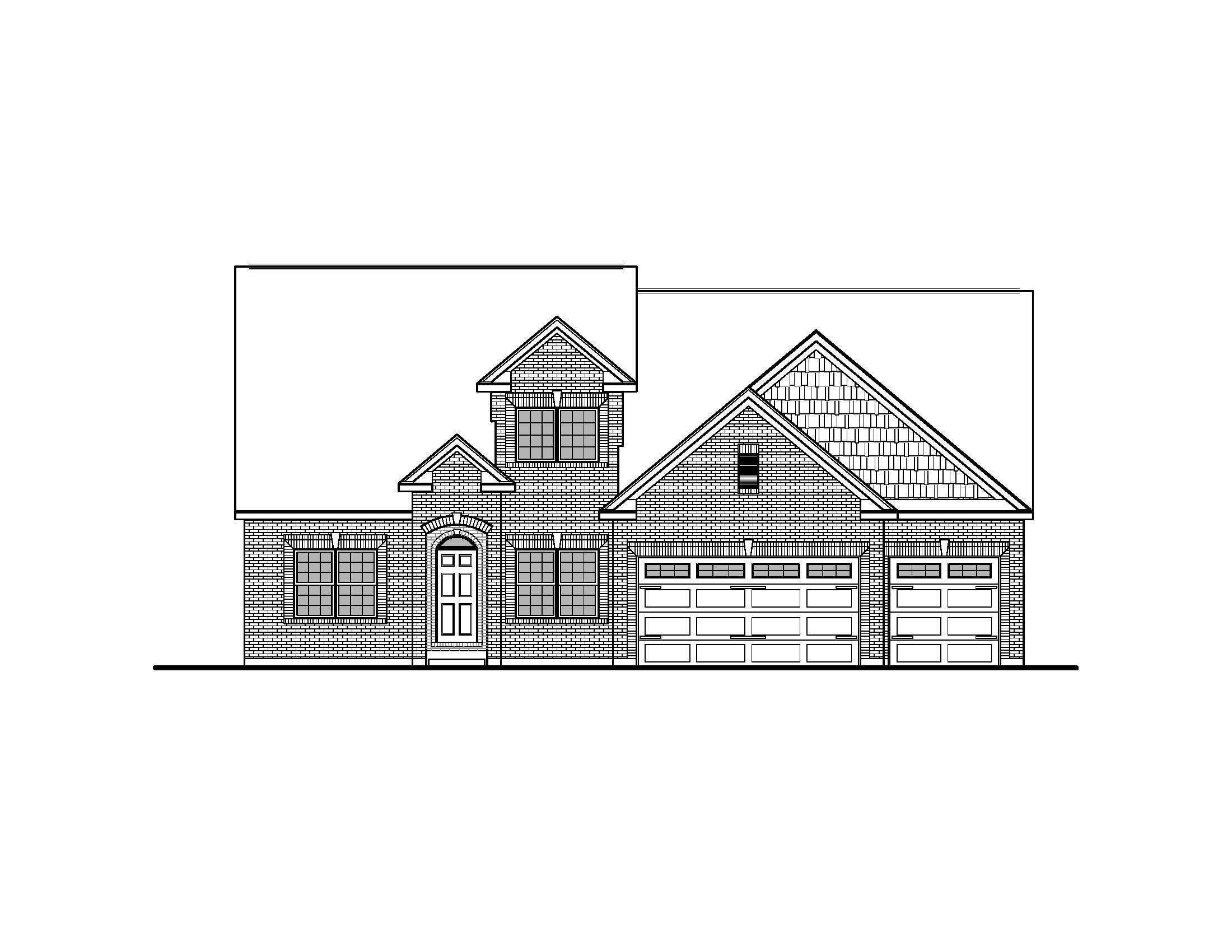 create a photo realistic perspective of the home with similar materials as drawn utilize a traditional red brick and grey shake siding with white trim and white garage doors with a black shingle roof render on a bright sunny day with lush vegetation in a suburban setting