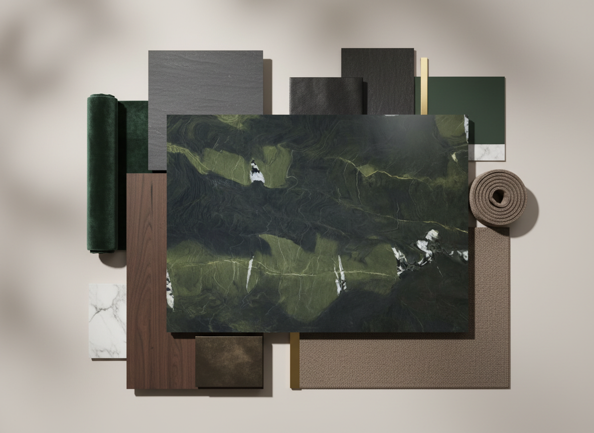 create a rich moody moodboard based on this slab of platinum crystal quartzite