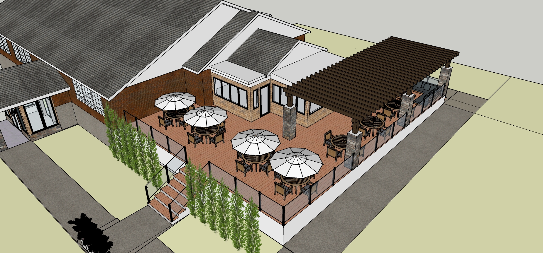 ocean in back ground and tree behind building