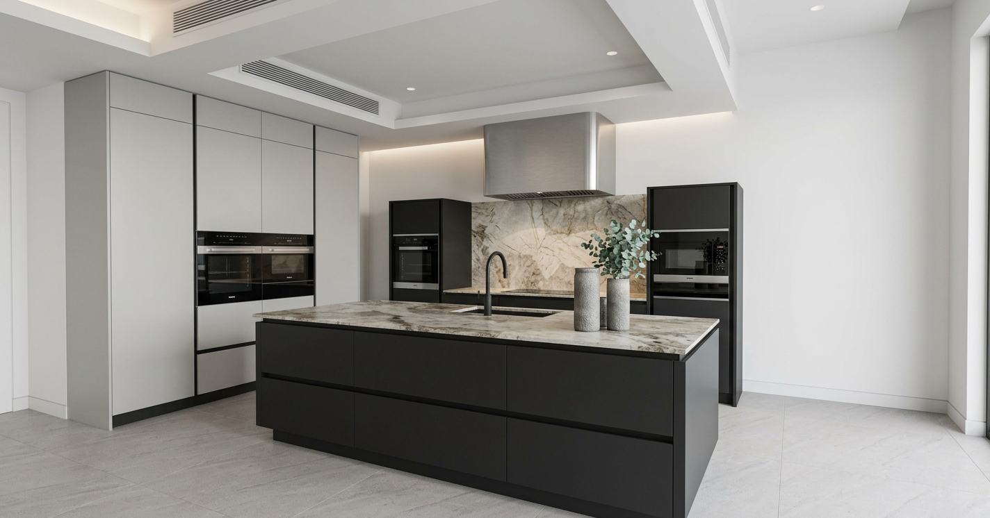 create a modern built in kitchen inside the existing room while preserving the exact architectural geometry strict constraints keep the existing room shape exactly as drawn do not move remove resize cover or redesign any existing wall window door opening or structural element all existing walls must remain visible in their exact original position and thickness the central service wall shaft in the middle of the room must remain exactly as it is do not turn it into a cabinet block furniture volume or full cladding element the central wall may only be lightly complemented with adjacent kitchen elements but its original wall geometry must stay clearly readable windows and doors must remain unchanged in size position and design existing wall lines and openings must be respected exactly layout create a closed reduit utility room on the left side using the existing wall layout as the basis the reduit should function as a utility laundry room with storage and laundry use the reduit must be integrated without changing the existing architectural structure kitchen design place the kitchen mainly along the back wall and right wall add a functional island in front of the kitchen use a clean modern kitchen design with integrated appliances light natural materials realistic proportions and architectural detailing keep the space open and plausible do not block windows doors or circulation paths important preserve the exact architecture first then add the kitchen no reinterpretation of the structure no invented walls no removed walls no shifted openings no covering the central shaft with full height cabinetry use the exact perspective and exact shell of the input image the freestanding central wall must stay a plain wall element and must not become a tall cabinet block build the kitchen around it not over it
