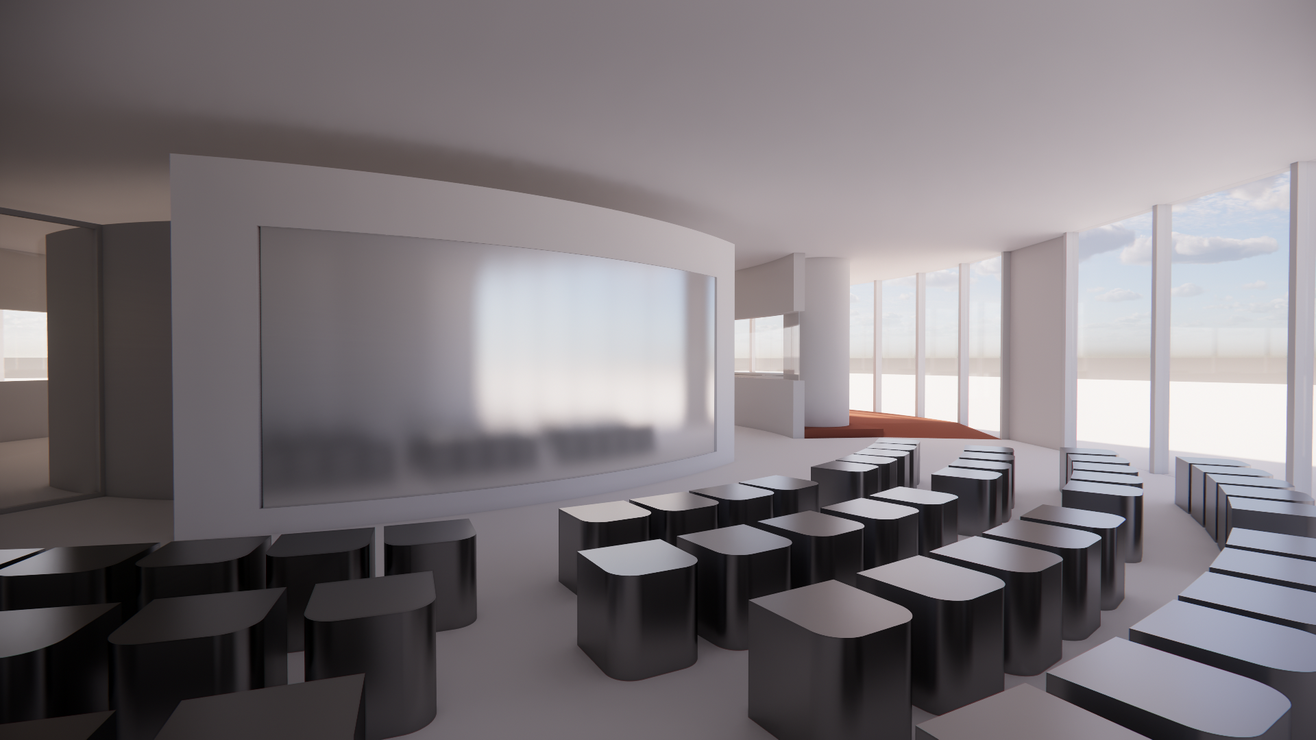 a curved walkway with a demo area low stainless steel seating are in neat curved rows at the front is an led screen with a robotics display showcase