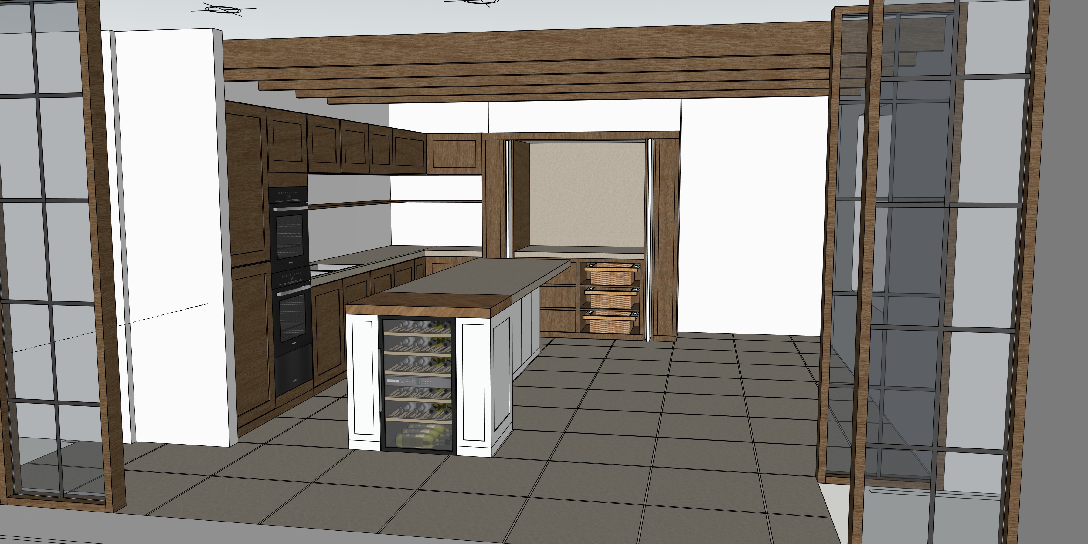 flooring needs to be contemporary sand stone the kitchen island doors need to be a mid ash wood finish the perimeter kitchen units need to be a light sand tone finish add a dining table to the right of the image with 8 chairs