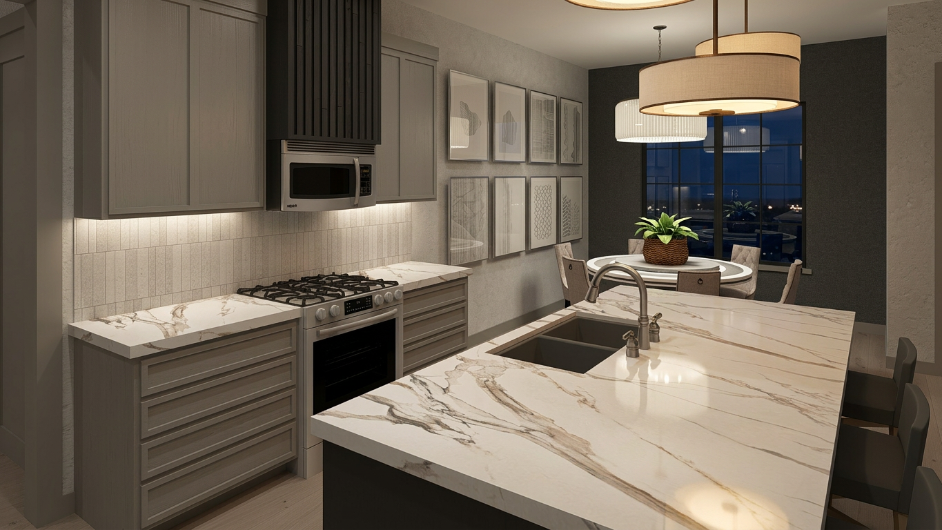 use the exact architectural geometry of the input image as fixed structure preserve all existing structural elements keep every existing wall exactly in the same position the freestanding service core steigzone in the middle of the room must remain in place and must stay visible as an architectural wall element do not remove move or merge this wall with furniture openings keep all windows exactly as they are keep the balcony door on the right side exactly in its position and fully visible do not cover or replace any window or door with cabinets or appliances kitchen design design a modern built in kitchen around the existing structure main kitchen along the back wall additional tall cabinets on the right side wall kitchen island placed in front of the central service wall integration of the service wall the central wall may be integrated into the kitchen design it may connect to the island or adjacent cabinets the wall must remain readable as a wall and cannot disappear utility room on the left side create a closed reduit laundry room with a door place washer dryer and storage shelves inside design style modern architectural kitchen light natural wood cabinetry light stone countertop realistic architectural interior visualization