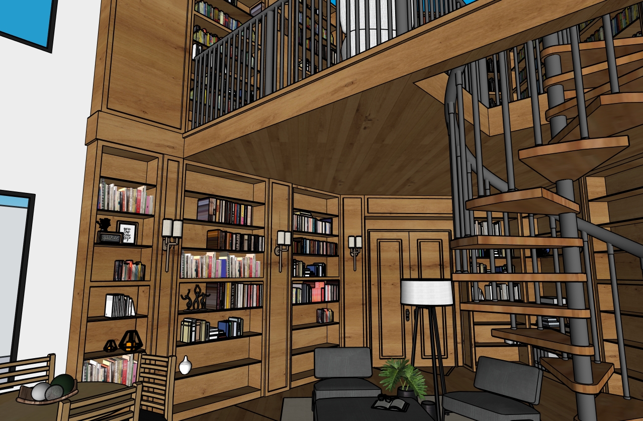 classical interior shot a cozy modern library interior with warm wooden bookshelves filled with colorful books the atmosphere is serene and inviting featuring a spiral staircase with sleek gray metal and wooden steps a soft white floor lamp casts a gentle glow over a stylish black armchair and green potted plant bright blue sky visible through a large window adding a touch of natural light the overall ambiance is peaceful and sophisticated architecture