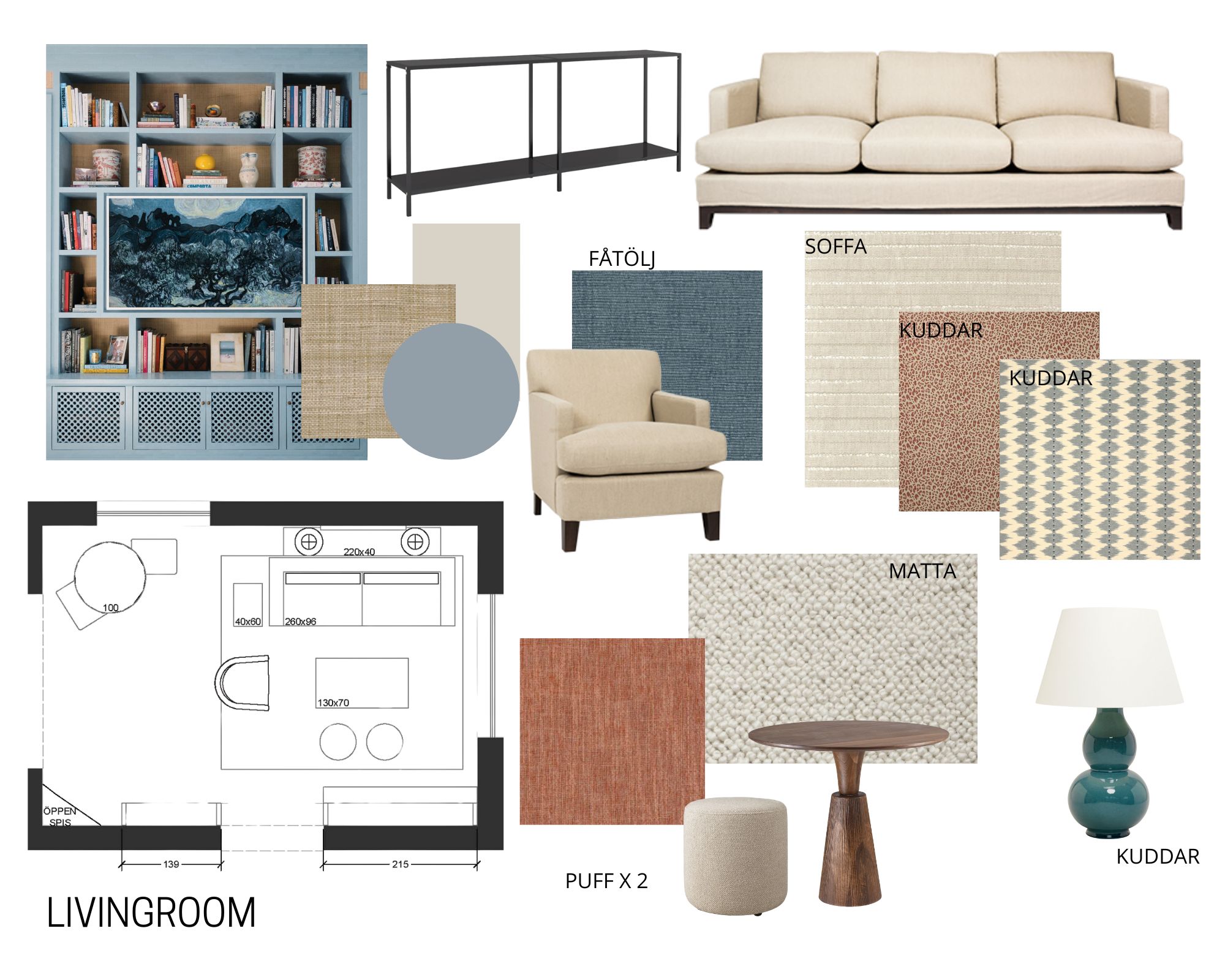 create a photorealistic render of a sophisticated yet inviting living room the room features two windows with white sheer curtains allowing soft natural light to filter in the color palette is inspired by the attached moodboard warm neutrals muted tones and elegant textures around the door to hallway we will build a bookcase inspired by the photo in design board in bookshelf a frame tv furniture include a white sofa coffee table with marble top upholstered blue armchair and subtle decorative details vase with flowers art soft rug under the table the overall mood should feel calm luxurious and welcoming timeless design with a hint of modern classic elegance natural materials such as wood linen and brass accents are preferred realistic lighting and soft shadows high end styling blue gray and rusty tones