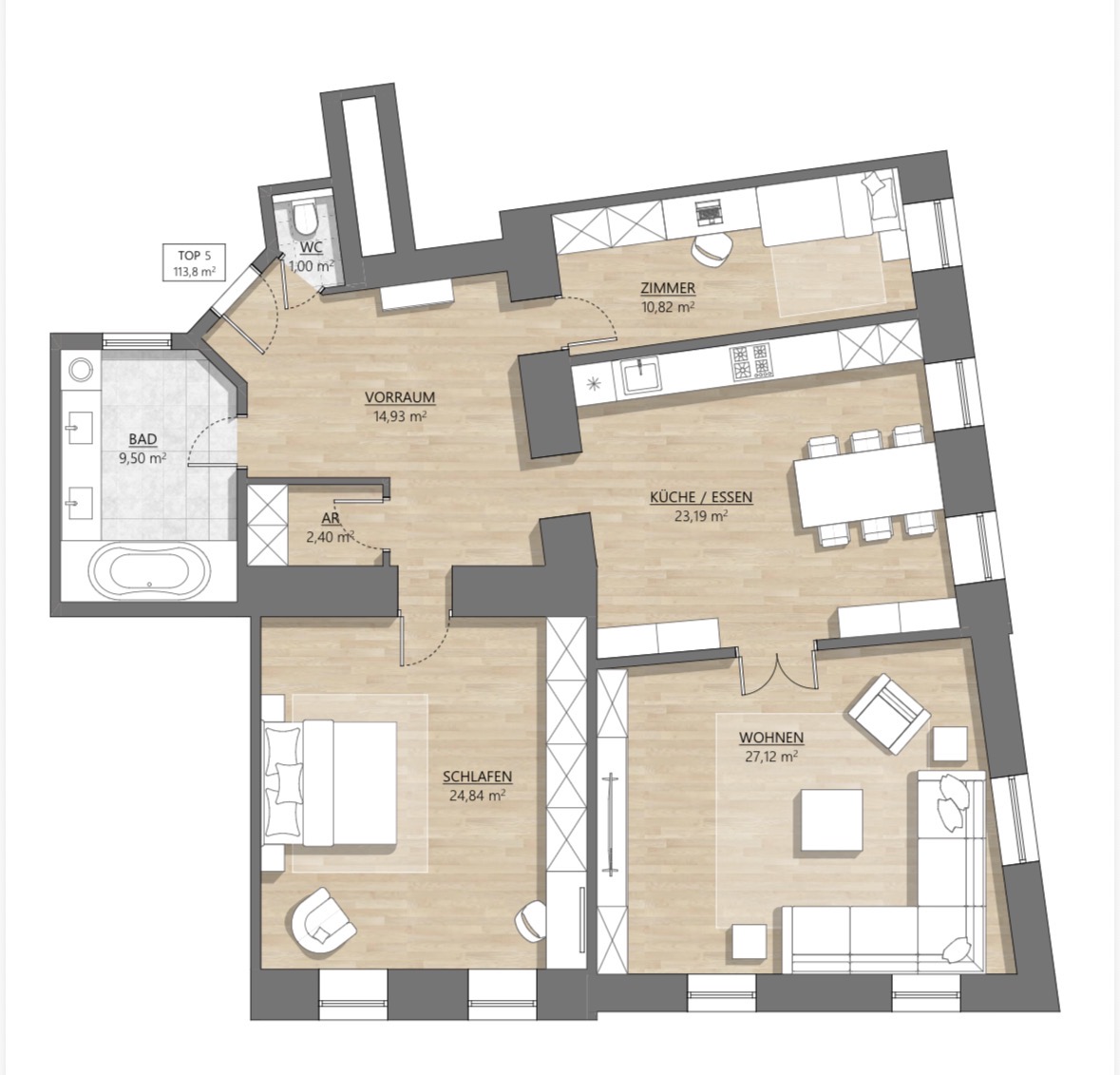 convert this floor plan into a realistic isometric 3d view of a full house show the space from an elevated angle with furniture walls and details visible skandinavischer stil wei e m bel fischgr t parkett innent ren alt wien keine teppichb den esstisch und k sten eiche use the same furniture as shows on the plan do not change the orientation of the floorplan