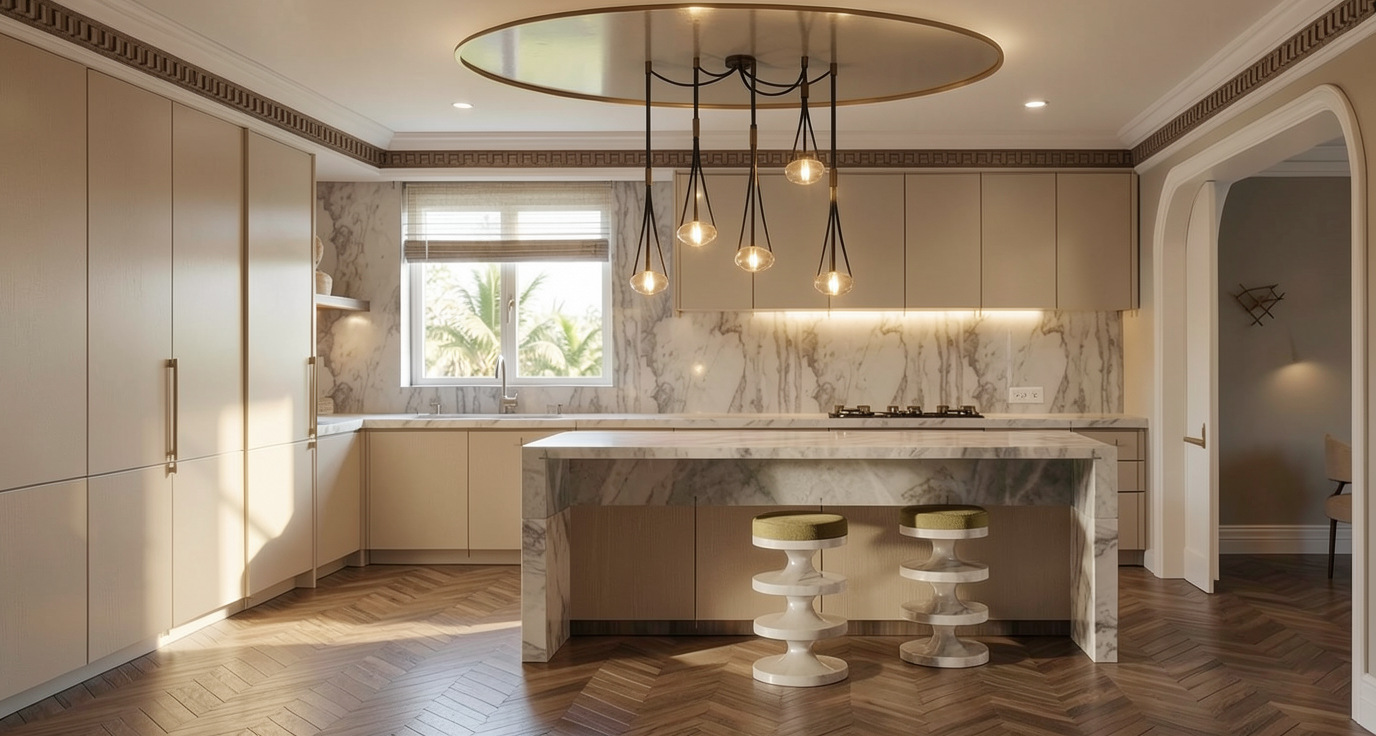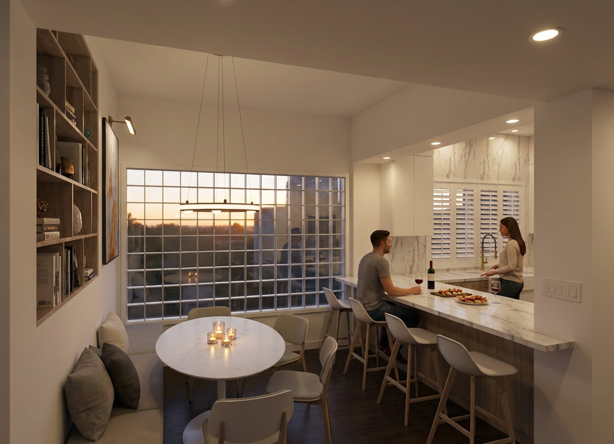 add light from the chandelier over the dining table add light from the recessed lights add some accessories on the kitchen counter add a woman standing at the sink in the kitchen add a man sitting on a middle stool at the counter drinking a glass of red wine add some appetizers wine glasses and a bottle of red wine on the counter make the light level in the kitchen a little lower and warmer in color add a floral arrangement on the dining table show the white calcutta same material on the wall of the kitchen as the countertops the louvered shutters in the kitchen window are painted white the upper cabinets in the kitchen are white slab doors the dining table top is white marble