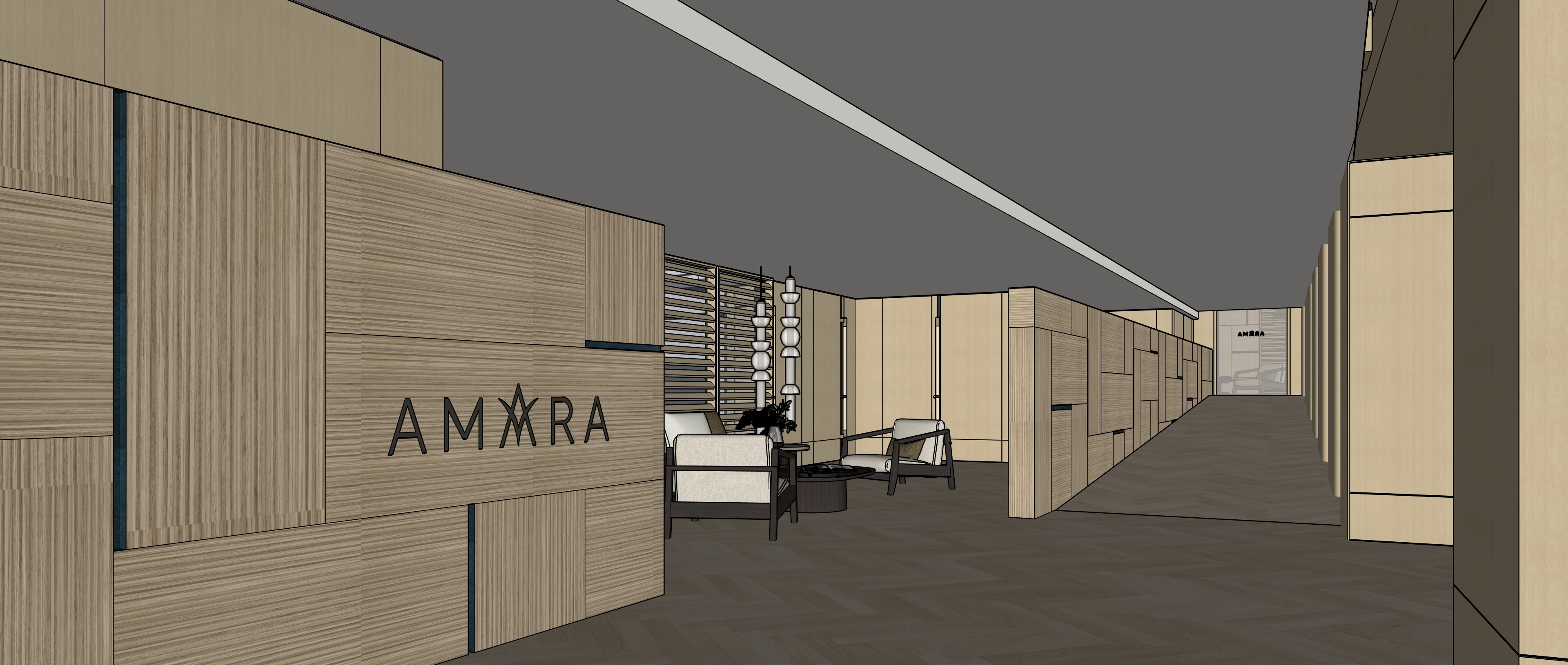 maintain all the materials and tones of it the recessed ceiling are to have cove there is soft natural lighting from glass behind the screen illuminating the lounge softly the amara logo is to be backlit the door at the end of the corridor is to be in tinted glass uplight the feature wall on the left and the left of the ramp corridor wall