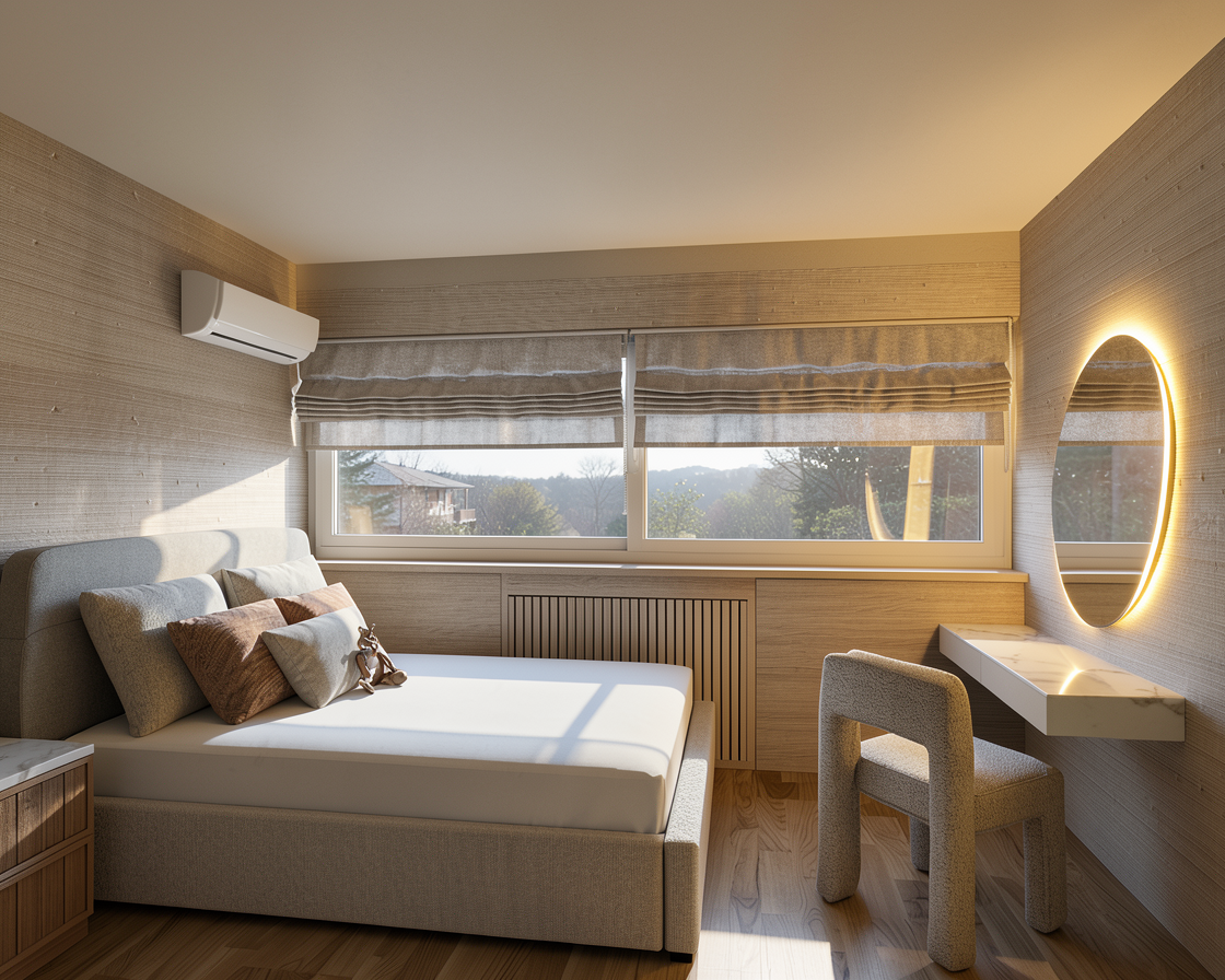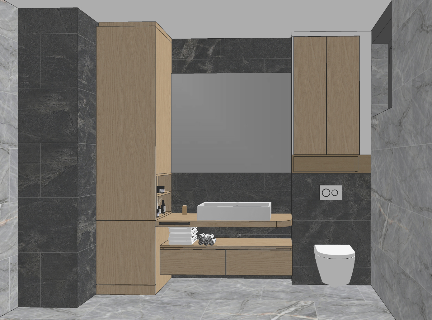 modern bathroom with mirror with led light and washbasin high element from the left side material honey colored wood towels and accessorize under the washbasin open shelf in high element from the back side above toilette storage area