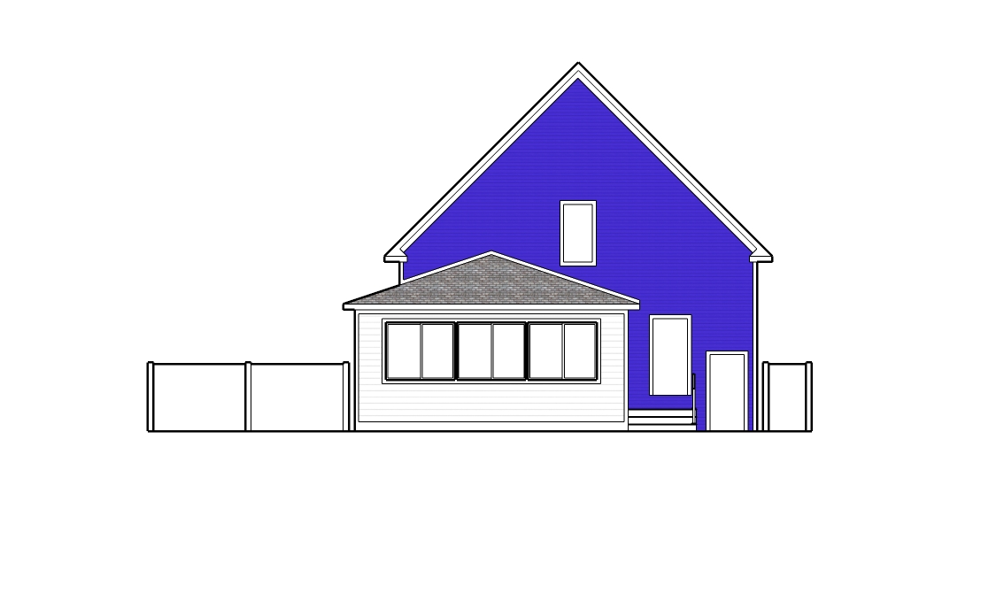 a older two story home with white vinyl siding on lower room to match drawing and dark blue horizontal siding on main house black asphalt shingle roofing retain the exact structure chimney rooflines foundation height doors windows and proportions exactly as shown in the reference image add a smooth concrete front patio with trex composite steps and pool width of home white vinyl fence on each side of home surround the property with few trees of tall mixed hardwoods place the sun behind the trees so warm golden sunlight beams through the branches casting soft rays and subtle dappled highlights across the patio siding and grass create ultra realistic lighting crisp shadows detailed textures in the wood siding and glass reflections and a vibrant clear sky with light atmospheric depth render in hyper realistic architectural visualization quality 8k resolution