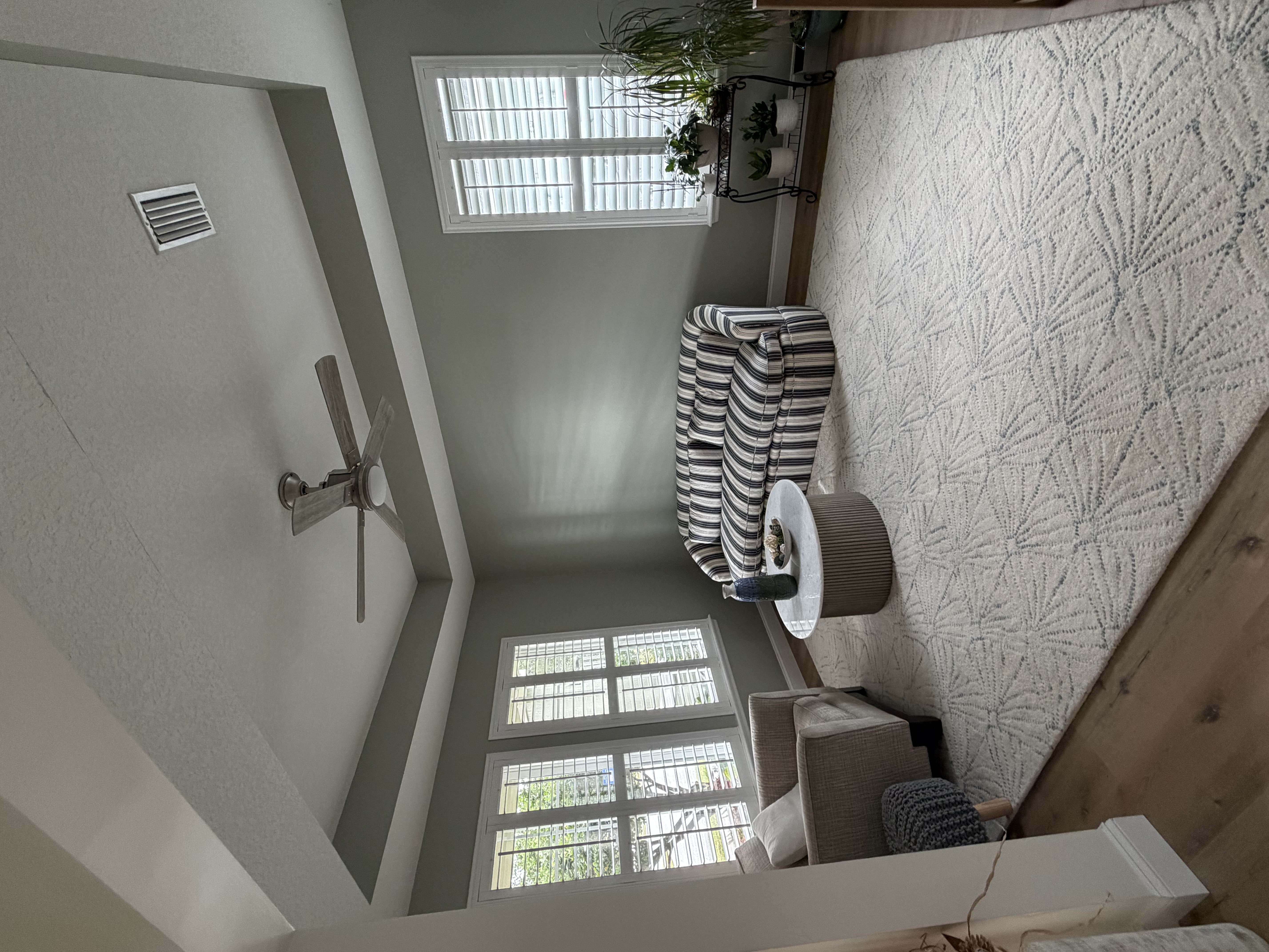 add linen drapery panels to both sides of the windows add side tables on both asides of the sofa with light blue round ceramic lamps