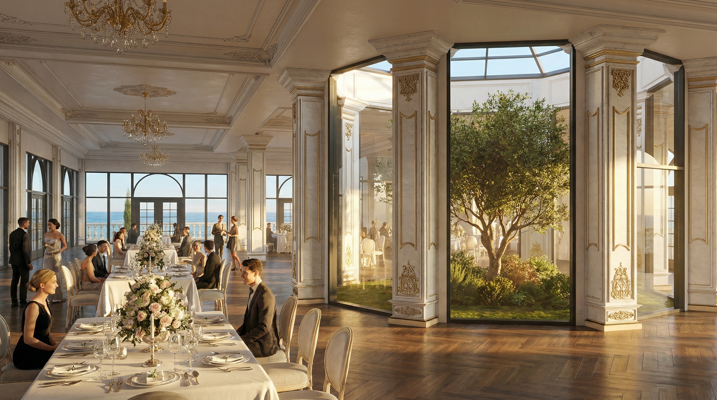 modern interior men changing room featuring the ceiling is subtle muted gray adding depth and balance floor is grey contrete soft ambient lighting casts gentle shadows enhancing the elegant atmosphere on the left side is matte deep antracyt wall with deep antracyt door on the right side is mirror on the wall from up to down on the front are two sitting in deep burgundy velvet with gold legs on the front wall on the left are four arched mirrors which are lighten up by led panels behind and three archway with sconce on the right side of front wall are antracyt door on the celling are soft lamps in room is no window so the lighting must be great