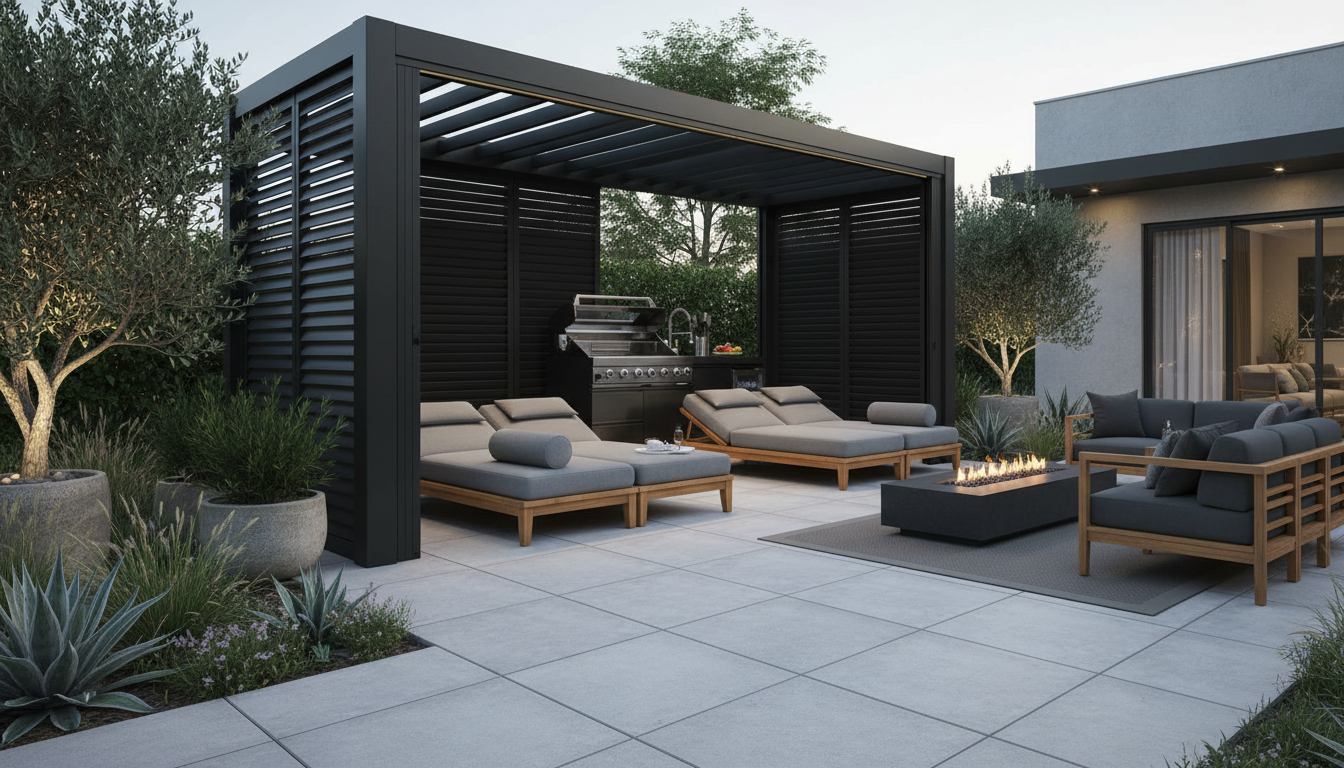 put this outdoor kitchen in a cabana made of black aluminum louvered pergola with aluminum side shutters with 2 teak lounge day beds