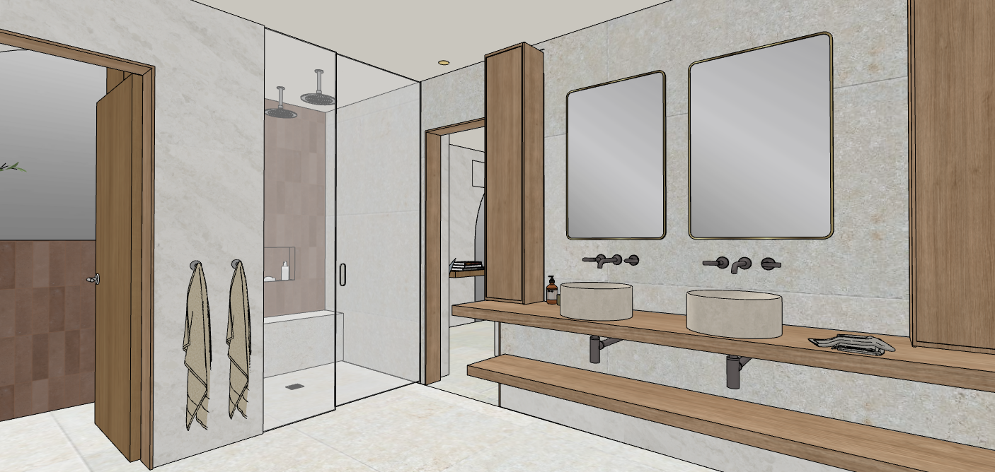 luminous bathroom organic plaster wall warm white stone floor tile in light beige terracotta wal tiles natural light and sink vessel in light beige concrete white oak cabinets no widows in this vieuw