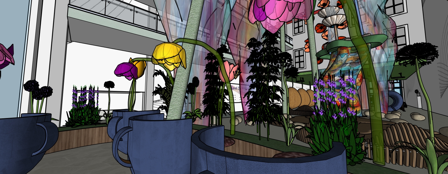 transform the existing garden scene into a photorealistic render with realistic lighting emphasizing natural sunlight and shadows add diverse people casually enjoying the space sitting and walking enhance details on flowers plants and materials for high realism include soft ambient and diffuse lighting to give warmth and depth to the environment making it look like a lively and welcoming urban garden area