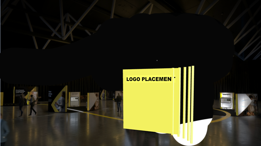 immersive stage environment with light tubes interviewer interviewing two business people with yellow lanyard both standing in front of the wall