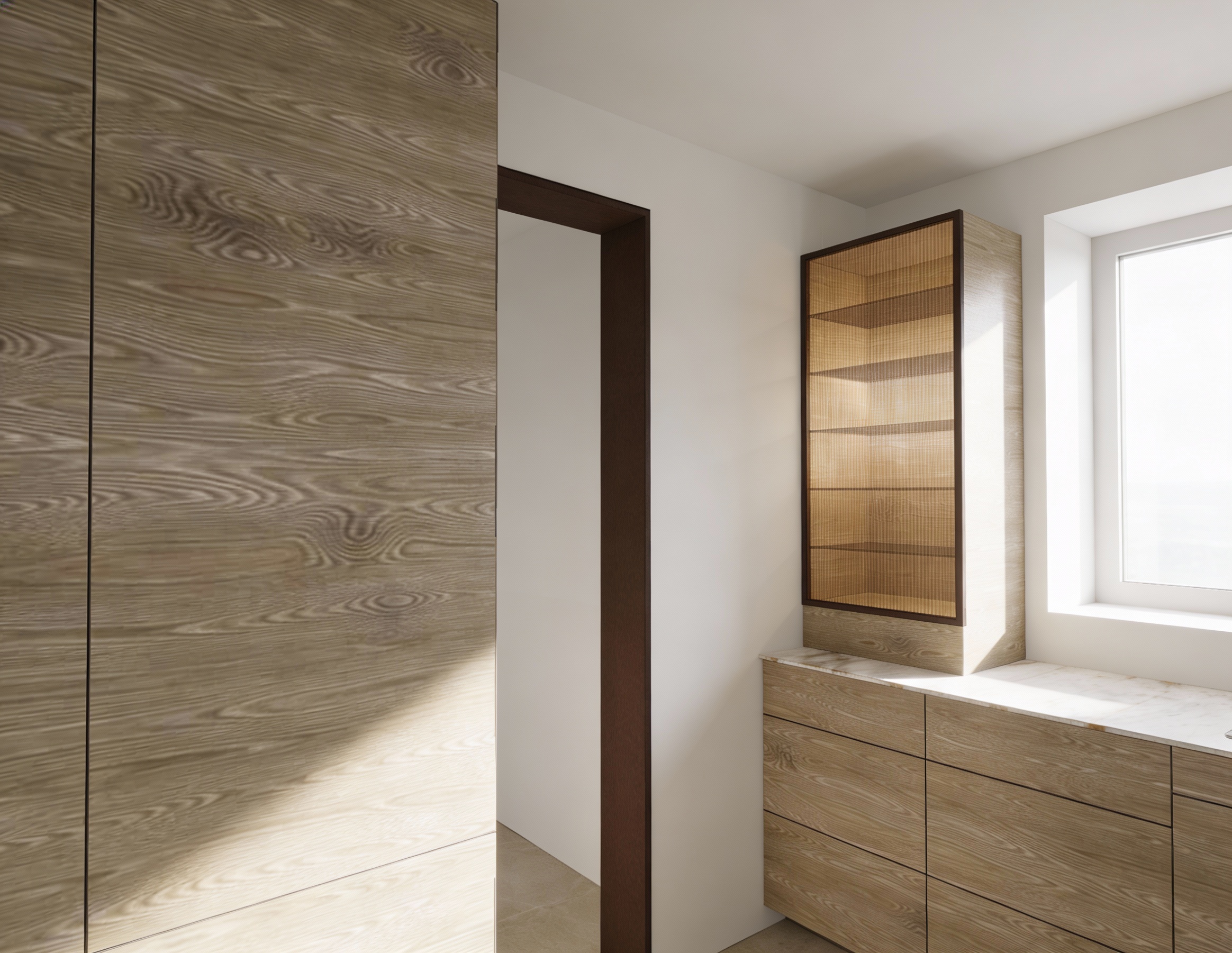 keep everything exactly as it is in terms of perspective lighting and materiality only add decorative elements inside the display cabinet give the display cabinet semi transparent ribbed smoked glass keep the interior lighting of the display cabinet unchanged