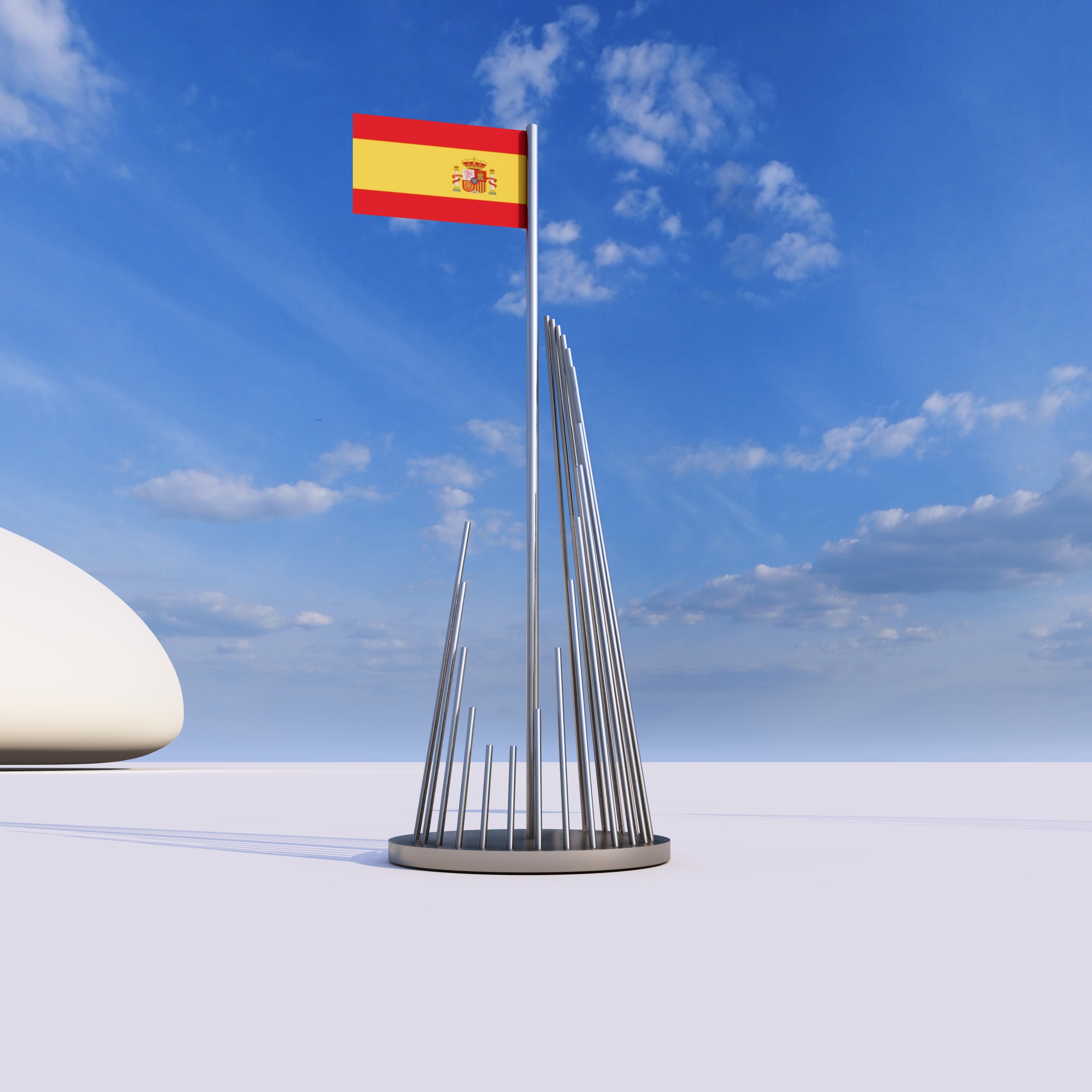 exact replication of the reference monument 19 circular metal profiles with varying lengths and curvatures maximum height 12 meters do not change the design do not add elements do not remove elements do not reinterpret exact geometry from reference image urban seafront promenade paved ground benches streetlights palm trees nearby buildings beach and sea only in the background no sand in foreground photorealistic architectural render summer day natural light add some people as a normal summer day add some movement to the flag i need the enviroment more urban than beachy the beach has to be more far remove the bach i only want the sea at the end of the street
