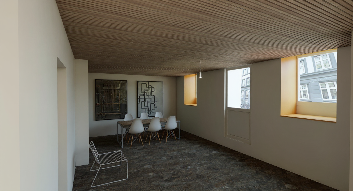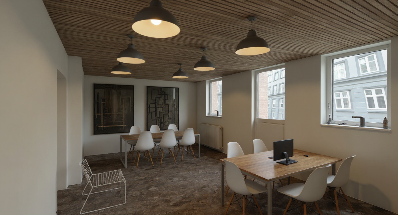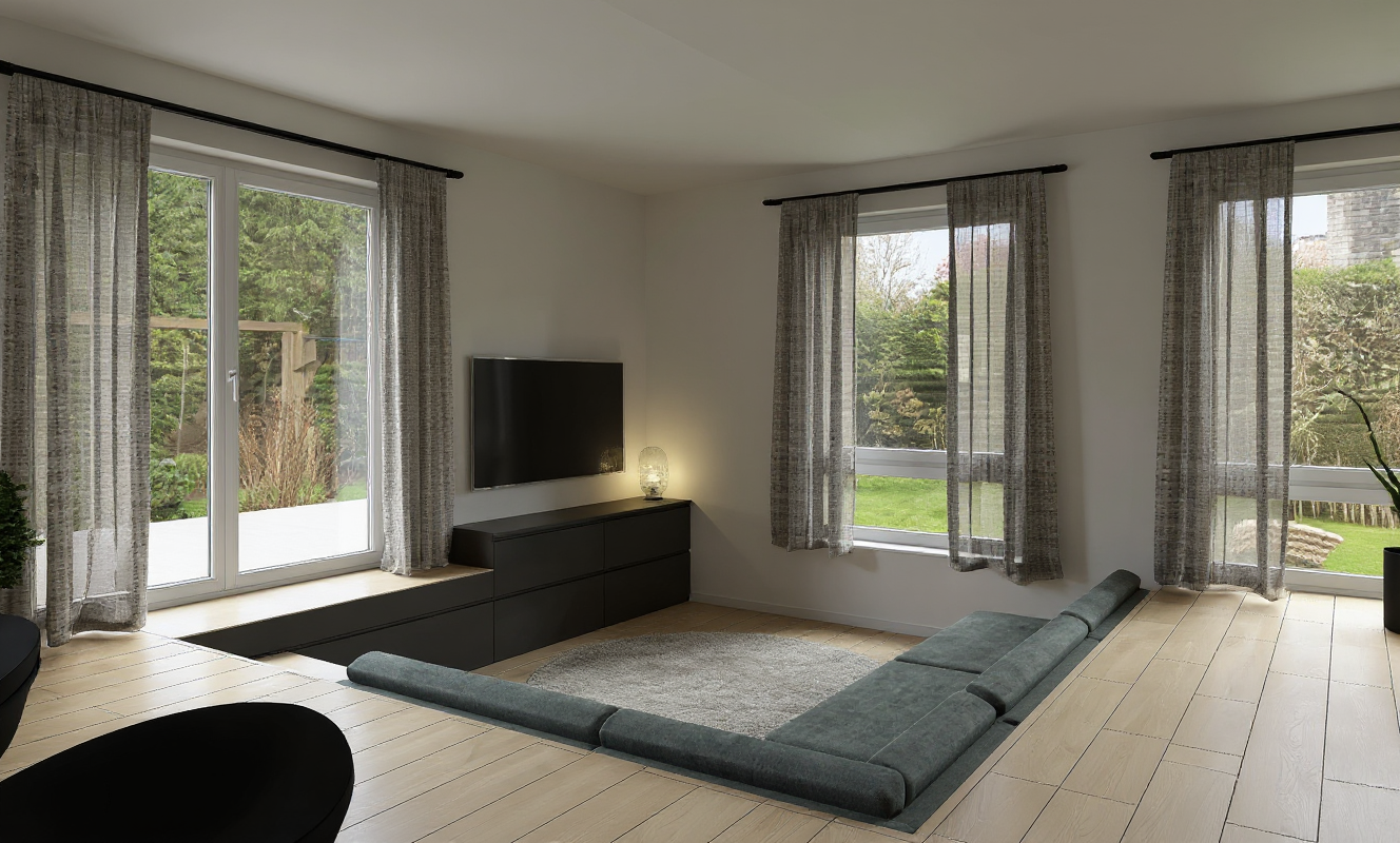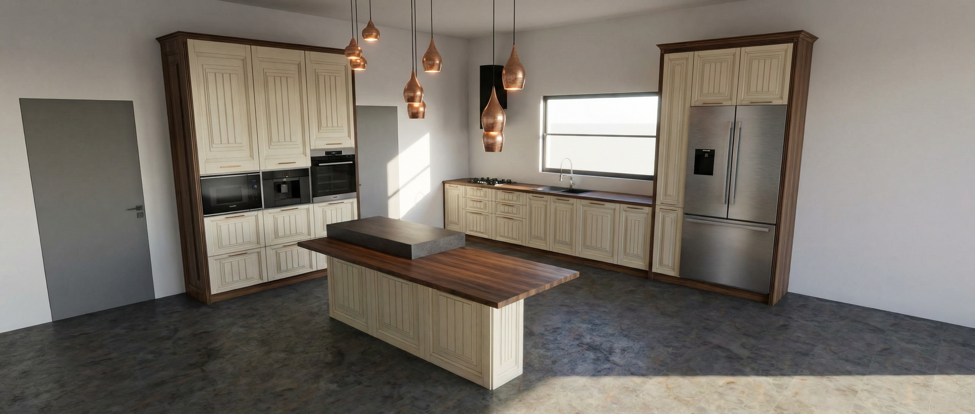 render a contemporary elegantly designed living and kitchen space the room features wooden cabinetry in warm oak tones paired with a sleek beige matte finish on the base cabinets the backsplash is a refined white marble with subtle gray veins the ceiling is a smooth white adorned with modern linear recessed lighting casting a gentle glow the dining area consists of a round table crafted from light oak surrounded by comfortable cream upholstered chairs in the living area a cozy textured beige sofa faces a wall mounted flat screen tv the tv wall is accented with vertical wooden slats matching the warm oak cabinetry adding depth and warmth to the atmosphere the room is softly lit with modern white pendant lights hanging above the table and beige walls create a neutral calming backdrop this setting exudes an atmosphere of warmth and tranquility perfect for a modern home