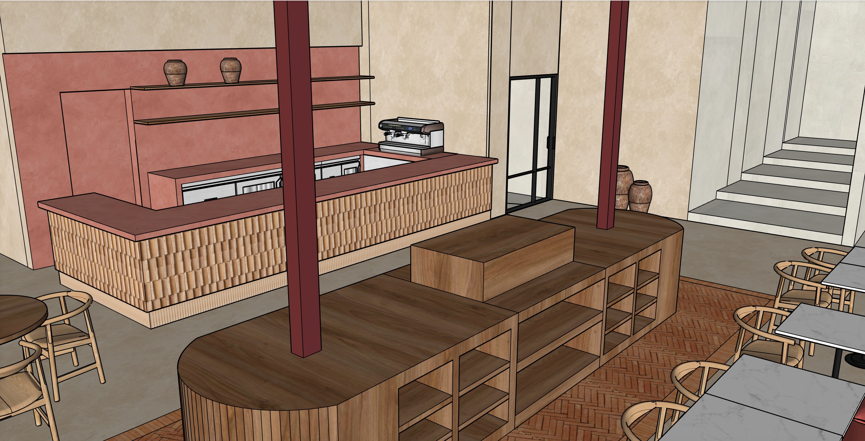 renderiza esta imagen y a ade un led en la parte trasera en la zona donde se cambia del color beige al terracota a ade un led debajo de la encimera perimetralmente y a ade algo de decoraci n en los estantes haz una luz natural pero como de atardecer