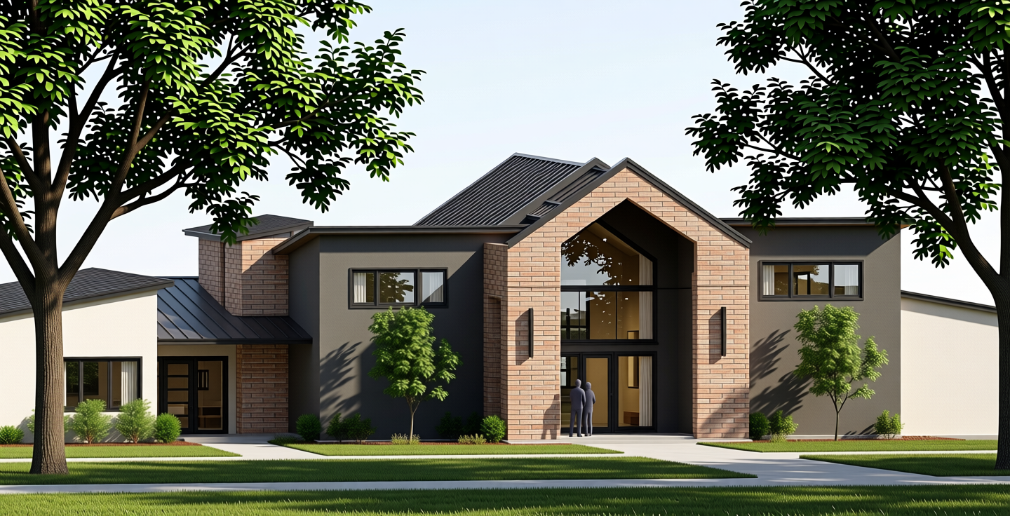 show some oak trees around and blue sky remove drapes in windows