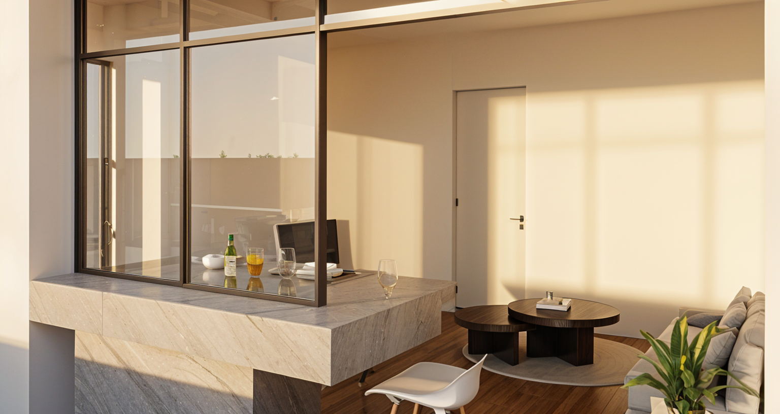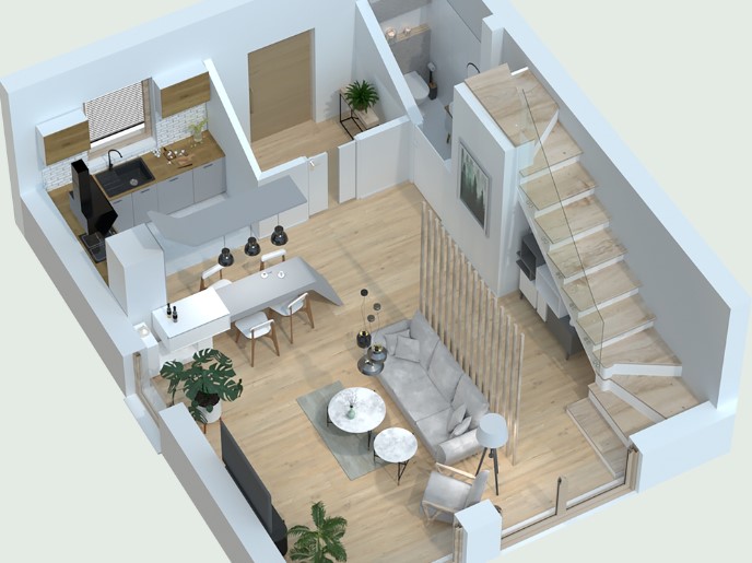 transform the provided axonometric top down apartment visualization into a realistic interior visualization viewed from ground level change the perspective from an overhead axonometric view to a human eye level interior perspective approx 150 170 cm camera height reconstruct the space faithfully based on the existing layout proportions and room relationships shown in the axonometry maintain correct room dimensions wall positions window and door placements apply realistic interior lighting natural daylight from windows accurate depth and proper perspective distortion typical for interior photography materials colors and finishes should remain consistent with the original visualization unless otherwise specified do not alter the apartment layout furniture placement or architectural elements only change the camera perspective and convert the visualization into a lifelike interior view with realistic textures lighting and shadows architecture