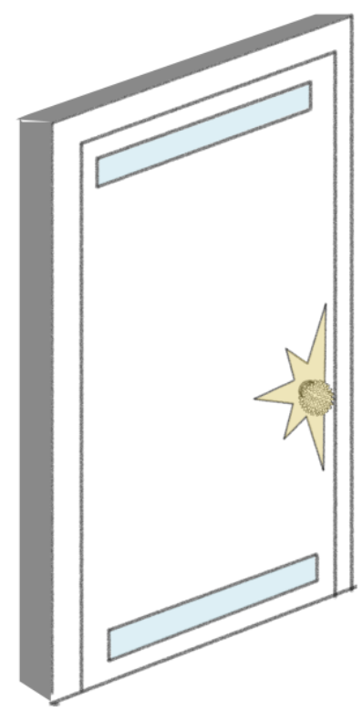 add subtle volumetric light beams coming through thin window slits in the top and bottom of the door the light is pouring in and the beams are shining onto the floor the environment around is dark the only light is the sun beaming pouring through the window slits make the scene slightly bigger in front of the door like it is in a large pitch black room the door is a light oak material the door handle is gold the handle itself is spikey and textured only enhance lighting