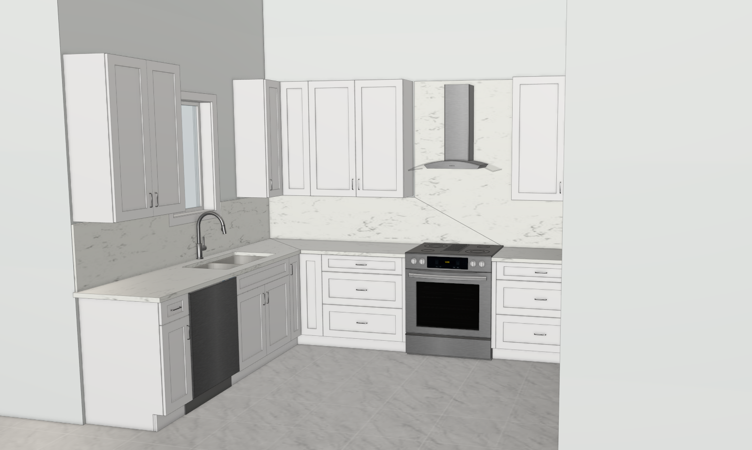 strict rules no exceptions do not modify the layout do not add any new architectural elements do not add crown molding do not add trim or decorative moldings do not add under cabinet led lighting do not add light strips anywhere unless explicitly requested do not change cabinet height do not change cabinet proportions do not change door style do not reinterpret the design do not add panels fillers or structural details not shown only enhance realism materials lighting and ceiling height as specified below if something is not explicitly requested do not add it ceiling height mandatory adjustment only cabinet height is 8 feet actual ceiling height must be 11 feet instructions increase wall height above cabinets to reflect 11 ft ceiling do not stretch cabinets do not add crown molding do not add trim above cabinets ceiling must remain flat and clean only recessed ceiling downlights are allowed no led strips no indirect hidden lighting lighting temperature 3000k 3500k warm neutral cabinet doors non negotiable standard american shaker flat recessed panel 90 degree inside edges no bevel no decorative inner profile not raised panel not slim shaker finish white semi gloss lacquer soft sheen not high gloss not matte maintain exact original door layout and proportions countertop backsplash seamless requirement material white polished marble subtle natural gray veining mandatory completely remove all visible seam lines no fabrication joints visible surface must appear as a single continuous slab no horizontal or vertical joint lines backsplash must also appear seamless and continuous increase realism with higher gloss polish stronger but natural reflections subtle material depth realistic edge thickness do not alter shape or thickness flooring medium format white porcelain tile black natural veining satin finish thin grout lines no pattern change no layout reinterpretation appliances improve realism only do not change position do not change size decor minimal decor allowed do not clutter do not add architectural elements decor must be subtle and removable camera eye level perspective architectural photography no distortion high dynamic range ultra realistic