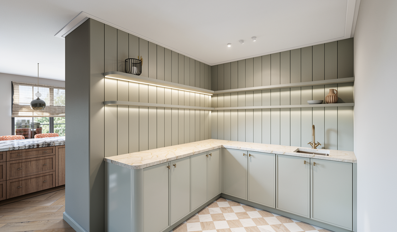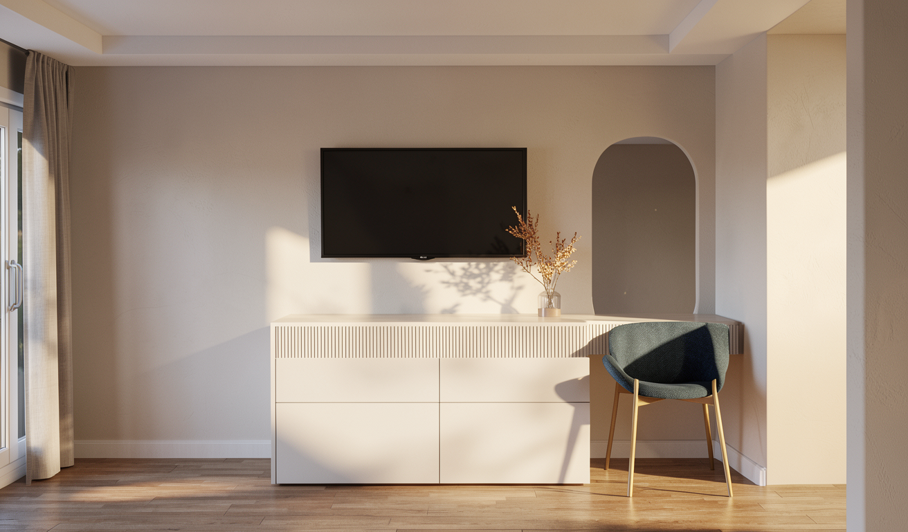 black oak framed wardrobe with walnut door and drawers dark blue grey walls and mid oak floor