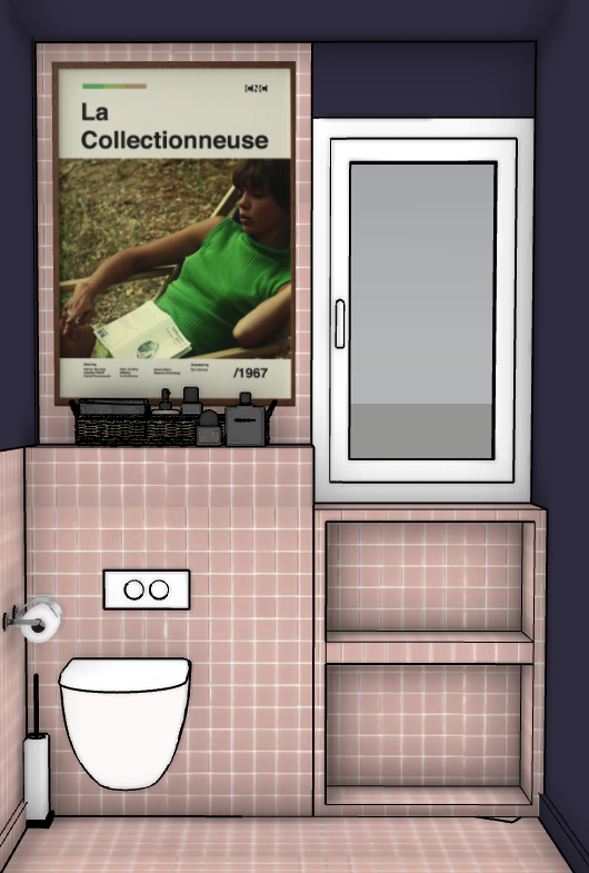 photorealist toilets light pinkltiles and deep blue painting soft daylight window view is the garden the flush button is white