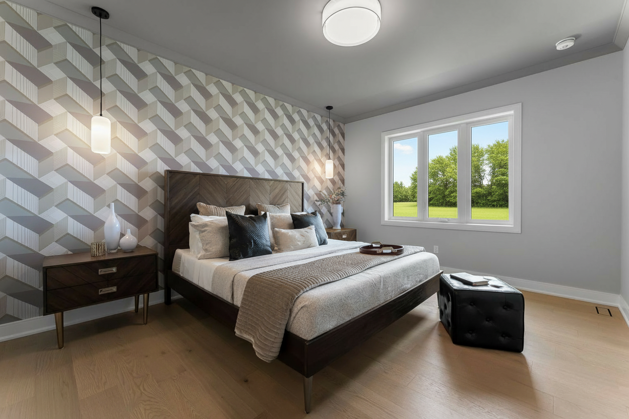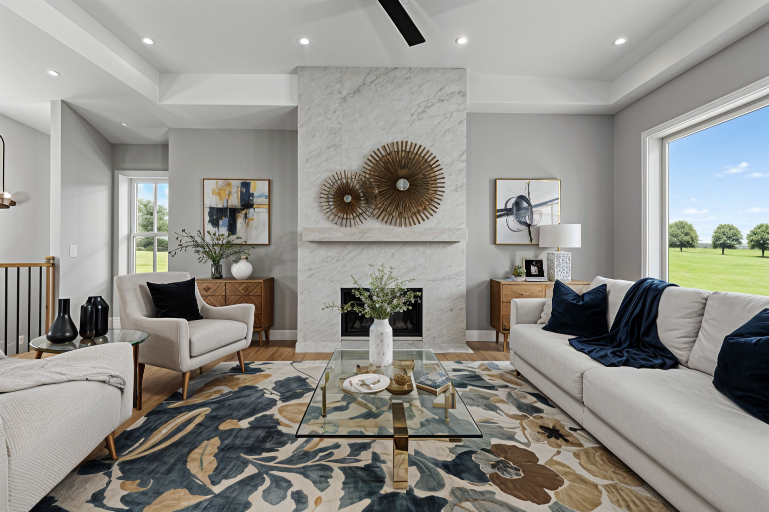 retain the structural elements of the home add green grass landscape through the windows few trees far away