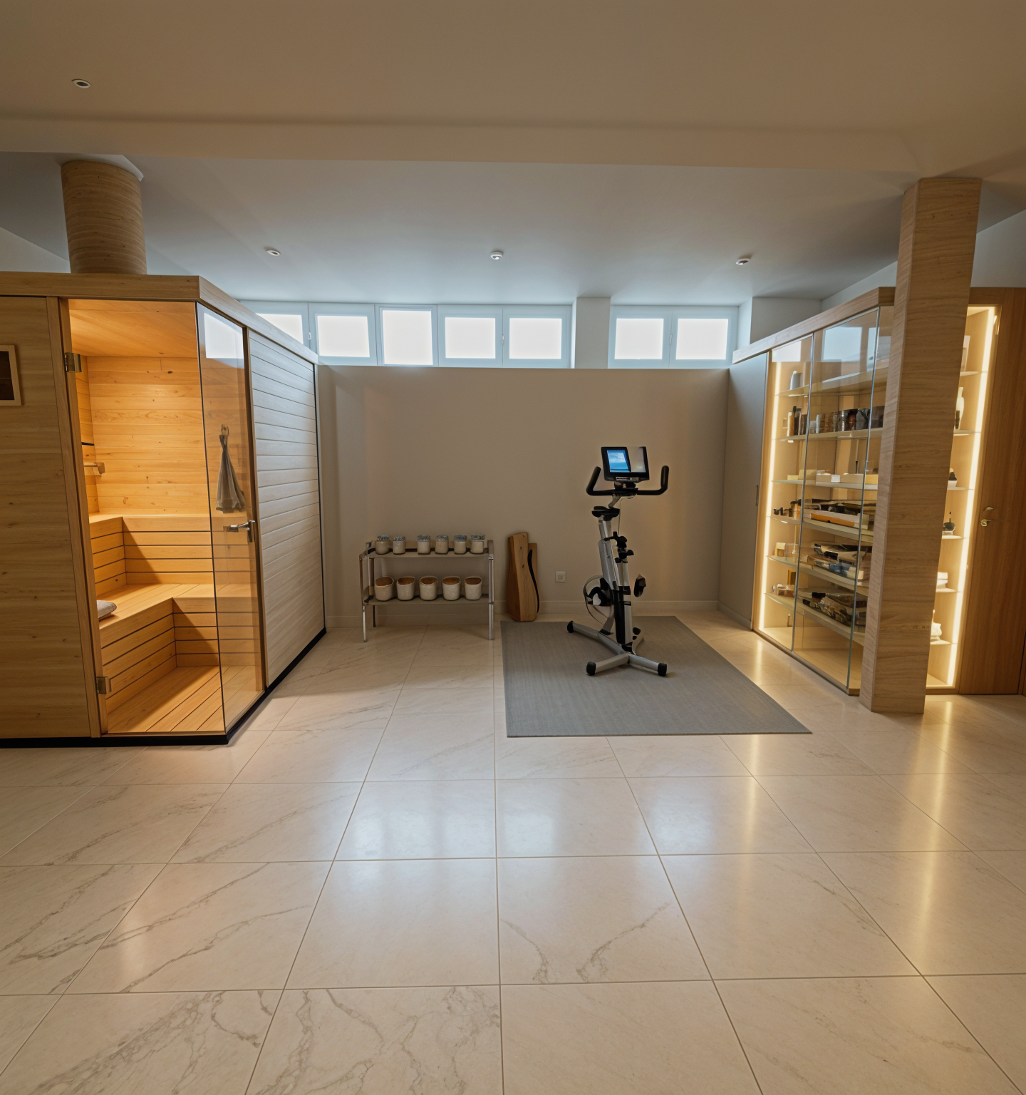 a room with a sauna on the left small gim in the middle a small wine cellar on the right wimdows are placed high from the floor sauna and wine cellar have glass door and a segment of the wall is slso in glass light beige tones travertine wood to match these tones architecture architecture