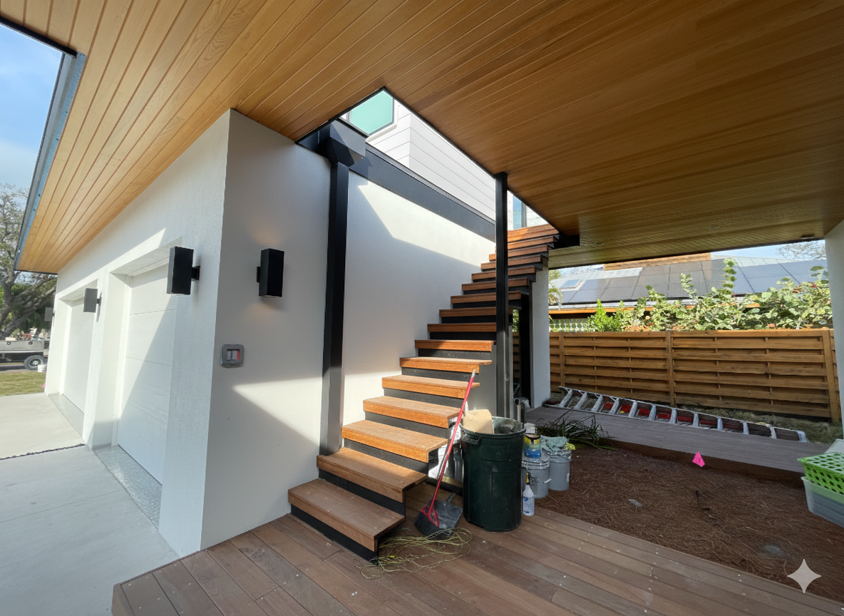 put a cable rail on my stairs the black vertical buster are mounted on the stairs tread every 4ft with top and bottom black rails with cables in between
