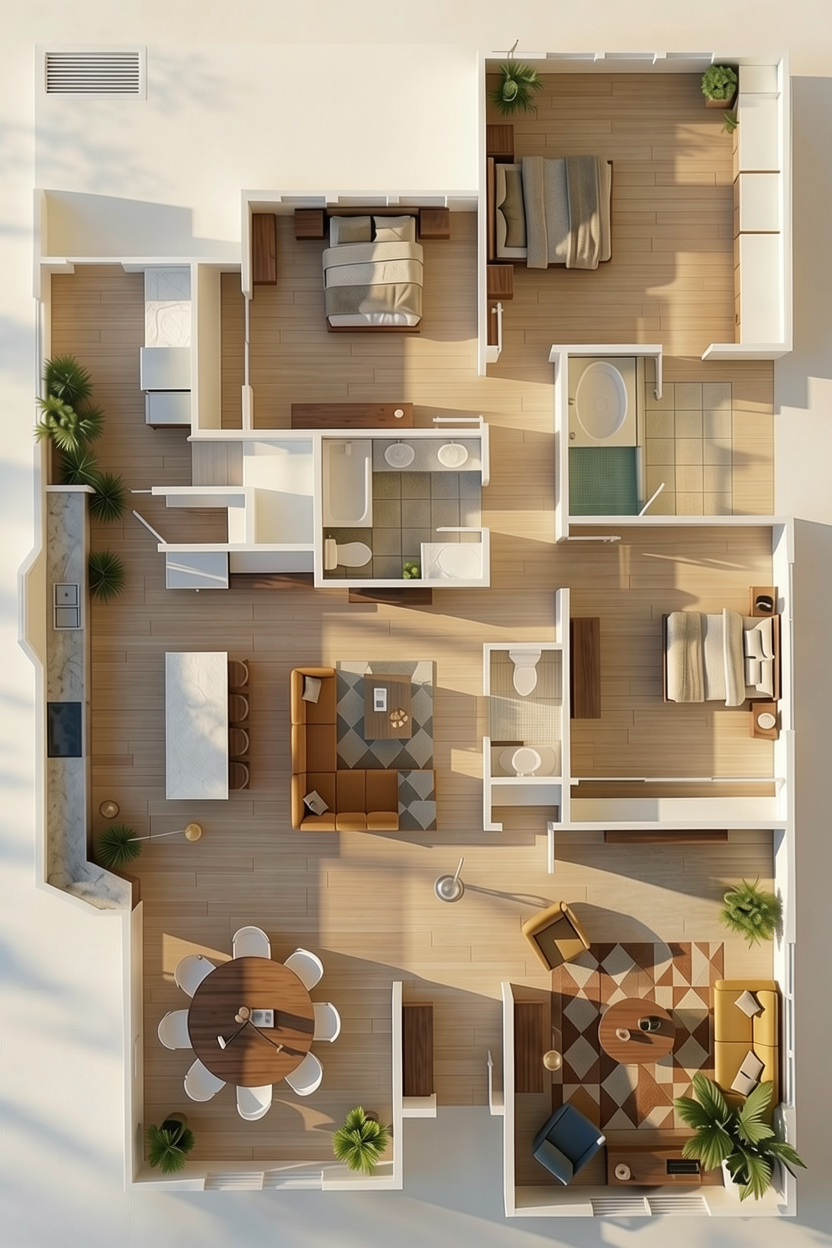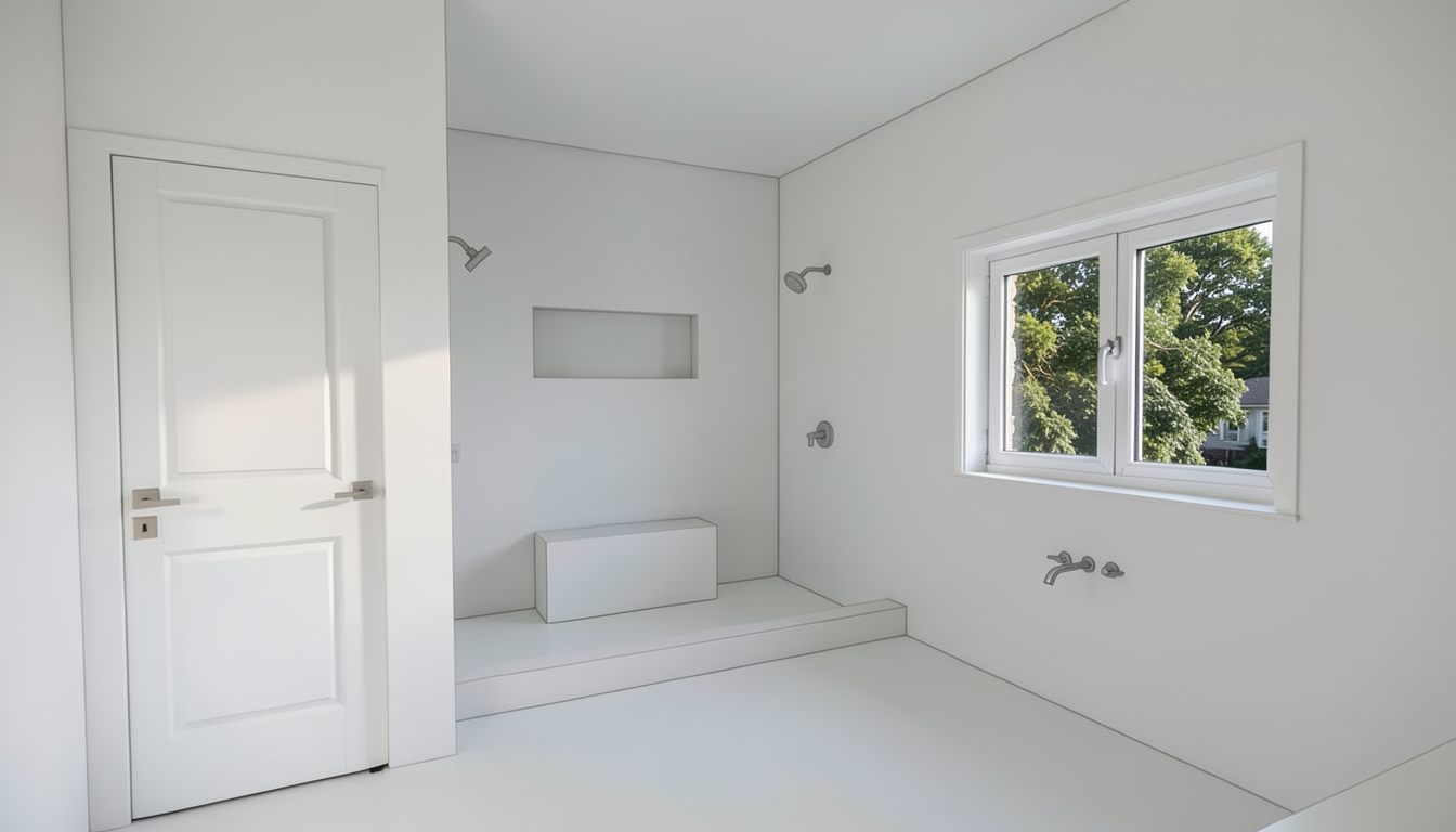 keep everything else the same white not materials or texture just add a modern flush mounted pannel door in white with one handle on the right and the window make a white modern window with molding not handle just window grid in white and outside the window juts put trees